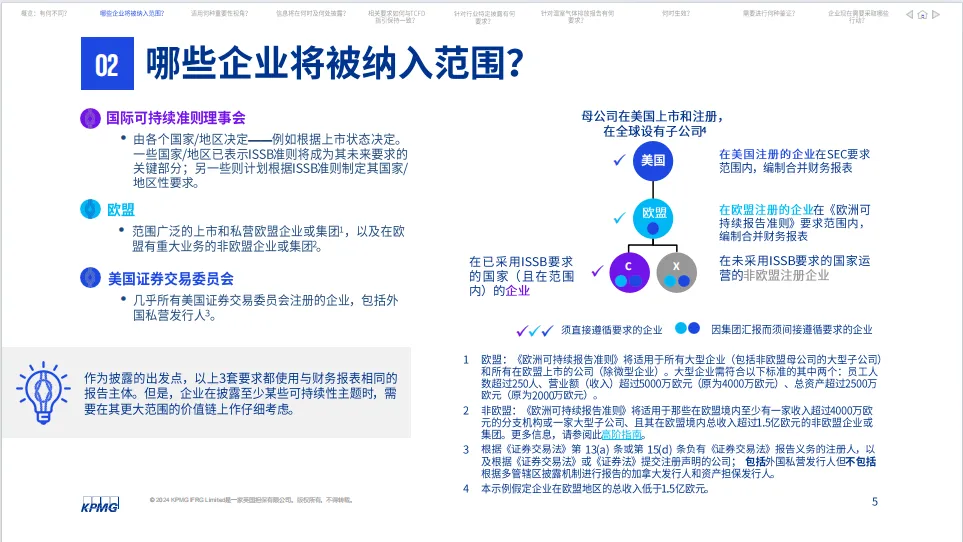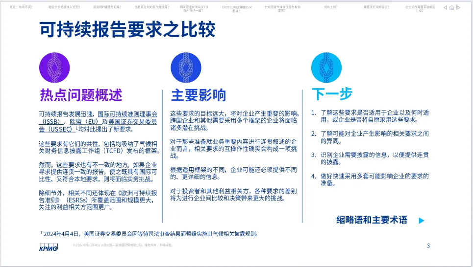 毕马威发布的《可持续报告要求之比较》报告提供了一个全面的视角,对比了不同地区和组织对企业可持续报告的标准和要求,揭示了国际间在推动环境、社会和治理(ESG)信息透明化方面的异同。