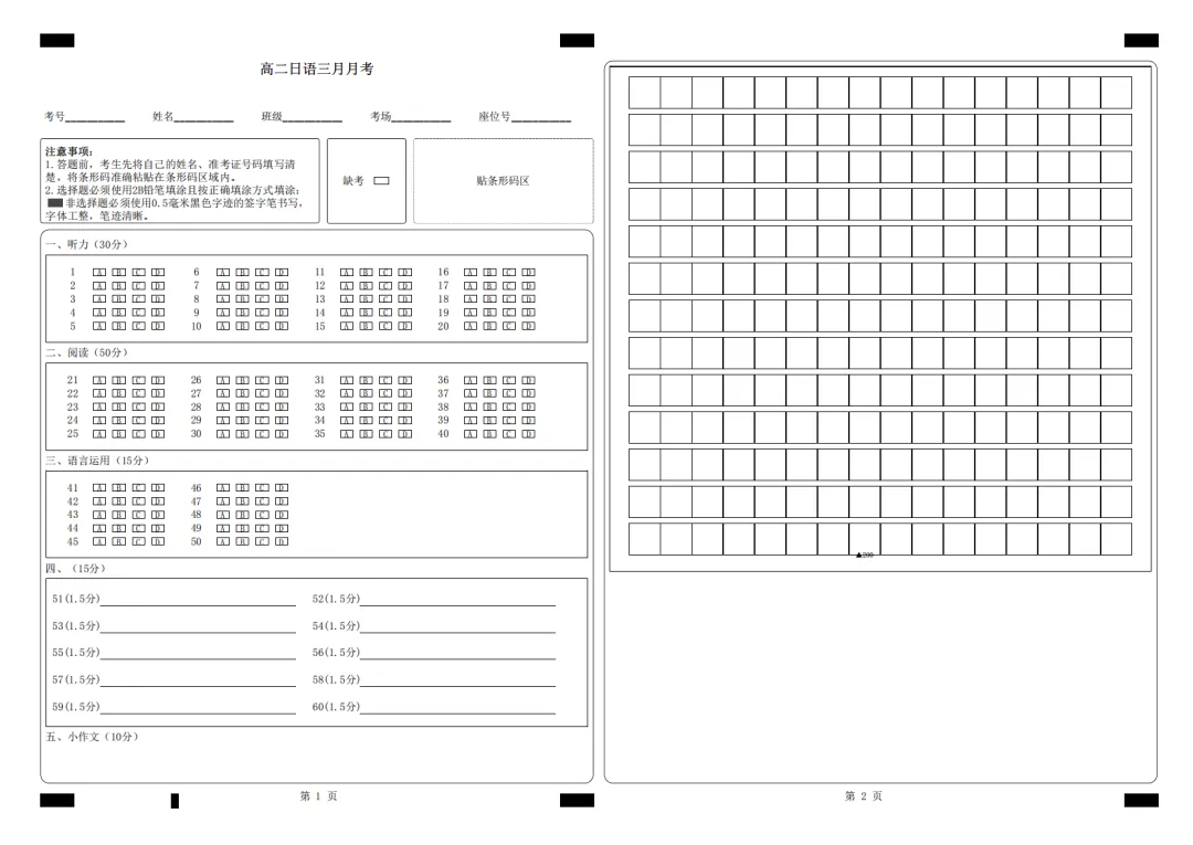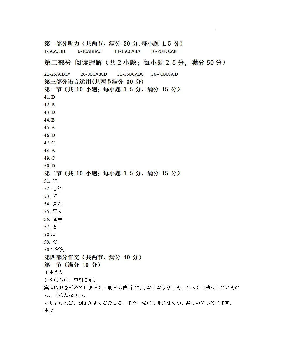 高二||WORD浙江2026年3月高二日语试卷(作文:邮件)+听力+答题卡+答案 点击文章底部“阅读原文”即可免费下载(已解压WORD) 浙江平阳县第三中学2026年上学期3月月考考试高二日语试卷 答题卡 答案 点击文章底部“阅读原文”即可免费下载(已解压WORD) 如需保存至夸克网盘,复制以下内容: 链接:https://pan.quark.cn/s/cd1fc4c27f70 高二||湖北云学联盟3月学科素养测评日语试题(作文:发信息;スポーツをしよう)+听力+答案及听力原文 高二||TJJE 新高考研究联盟高二3月日语试题(作文:变形;私の大学生活)+听力+答题卡+答案