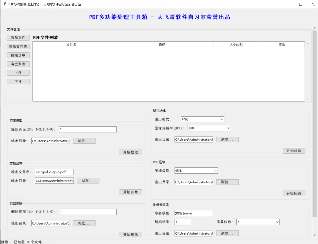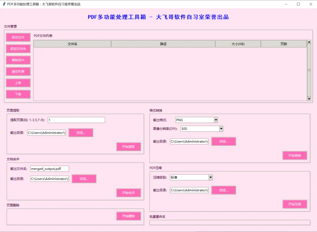 大家好,我是大飞哥。平时办公里碰PDF的活儿真不少——要提取某几页、合并多份文档、转成图片,或者把大PDF压小,之前要么用在线工具(怕泄密),要么装个大软件(占内存还复杂)。直到摸到这个“超全PDF多功能处理工具箱”,才发现这些需求一个小工具就能全搞定,粉色界面看着还挺清爽,用着是真顺手。