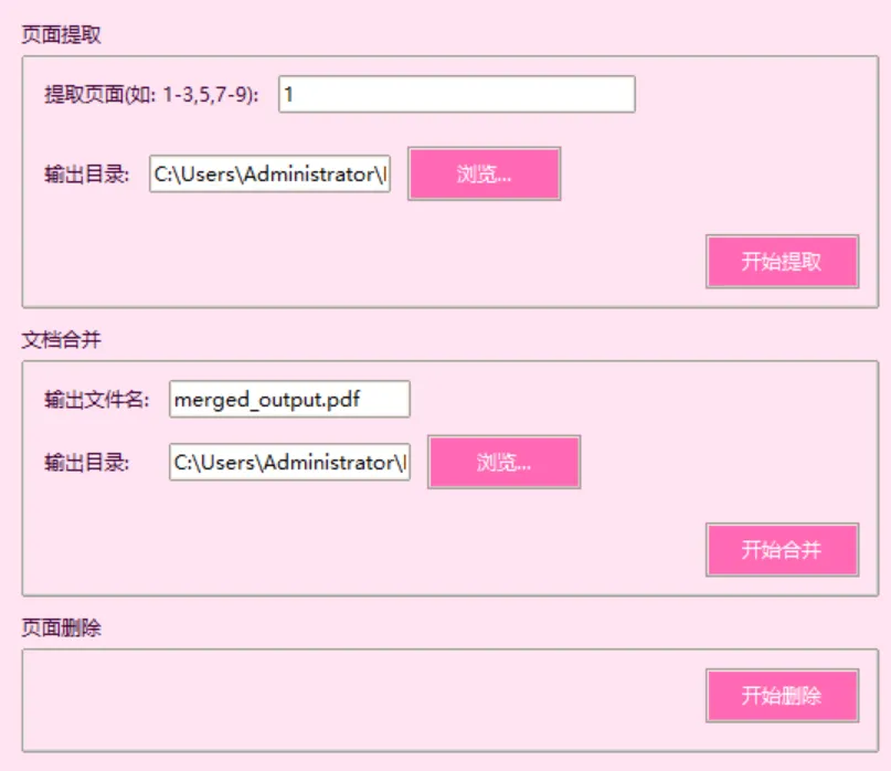它最实在的就是“功能全还不啰嗦”,打开界面一眼就能看到所有核心功能:页面提取能按“1-3,5,7-9”这种格式精准选页,我之前要从几十页的报告里抠3页数据,输个范围点“开始提取”就成,不用一张张删;文档合并更方便,把要合并的PDF都加到列表里,调个顺序点“开始合并”,直接生成一份新文档,省了开PDF阅读器折腾的功夫。