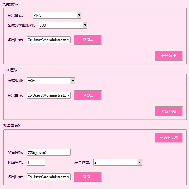 格式转换和压缩这俩功能我用得最多:转格式能选PNG、JPG这些常用图片格式,还能调DPI(我一般设300,转出来的图够清晰);PDF压缩有“标准”“高压缩”这些选项,之前发邮件碰到PDF太大发不出去,用它压一下,体积能小一半还不怎么影响清晰度。还有批量重命名,能设“文档(num)”这种模板,给一堆PDF按顺序改名,不用手动改序号。