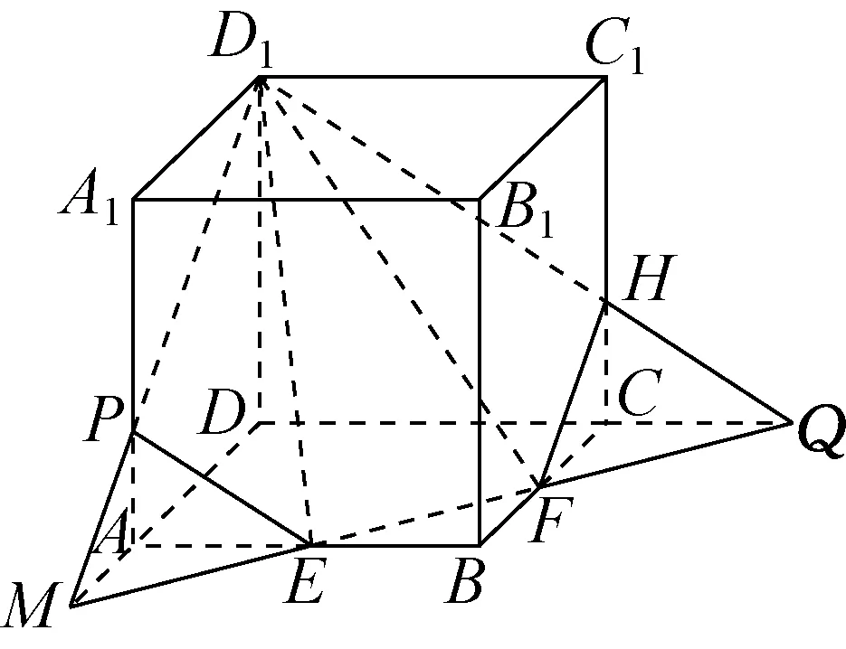 【解析】 方法一:如图(1),延长DA,DC,与直线EF分别交于点M,Q,连接D1M,D1Q与A1A,C1C分别交于点P,H,连接PE,HF,则五边形D1PEFH所在平面即为截面.因为正方体的棱长为2,点E,F分别是AB,BC的中点,所以EF=12×22+22=2.由Rt△BEF≌Rt△CQF≌Rt△AEM,得AM=CQ=BE=BF=1,EF=ME=FQ=2,所以P,H分别为靠近A,C的三等分点,故A1P=C1H=43,所以由勾股定理得D1P=D1H=\rc\)(\a\vs4\al\co1(\f(43)))2=13)3,PE=FH=\rc\)(\a\vs4\al\co1(\f(23)))2=13)3,所以截面多边形的周长为D1P+PE+EF+FH+D1H=13)3×2+13)3×2+2=213+2.