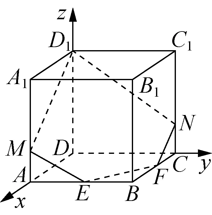 方法二:因为平面AA1D1D∥平面BB1C1C,则过点D1,E,F的平面必与AA1,CC1相交,设过点D1,E,F的平面与AA1,CC1分别交于点M,N.因为过点D1,E,F的平面与平面AA1D1D和平面BB1C1C分别交于D1M与NF,所以D1M∥NF,同理可得D1N∥ME,如图(2),过点D1,E,F的平面截正方体ABCD-A1B1C1D1所得的截面图形为五边形D1MEFN.以D为坐标原点,分别以→,→,→的方向为x轴、y轴、z轴正方向建立空间直角坐标系Dxyz,设AM=m,CN=n,则M(2,0,m),N(0,2,n),E(2,1,0),F(1,2,0),D1(0,0,2),所以→=(0,1,-m),→=(0,2,n-2),→=(2,0,m-2),→=(1,0,-n).因为D1N∥ME,D1M∥NF,所以-2m=n-2,-2n=m-2,)解得m=\f(2323),所以AM=23,CN=23,所以A1M=43,C1N=43,所以在Rt△D1A1M中,D1A1=2,A1M=43,所以D1M=133.同理D1N=133.在Rt△MAE中,AM=23,AE=1,所以ME=133.同理NF=133.在Rt△EBF中,BE=BF=1,所以EF=2,所以D1M+D1N+ME+NF+EF=2×133+2×133+2=213+2,即过点D1,E,F的平面截正方体ABCD-A1B1C1D1所得的截面多边形的周长为213+2.