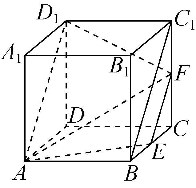 【解析】连接BC1,AD1,D1F,如图所示,因为E,F分别是BC,CC1的中点,所以EF∥BC1.在正方体中,AD1∥BC1,所以EF∥AD1,所以A,D1,E,F在同一平面内,所以平面AEF截该正方体所得的截面为平面EFD1A.因为正方体的棱长为2,所以EF=2,AD1=22,D1F=AE=22+12=5,则点E到AD1的距离为等腰梯形EFD1A的高,即5)2-\b\lc\(\rc\)(\a\vs4\al\co1(\f(2\r(2)-\r(2)2)))2=2)2,所以截面面积为S=12×(22+2)×2)2=92.
