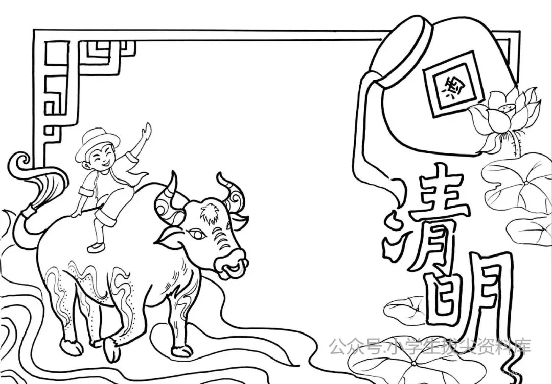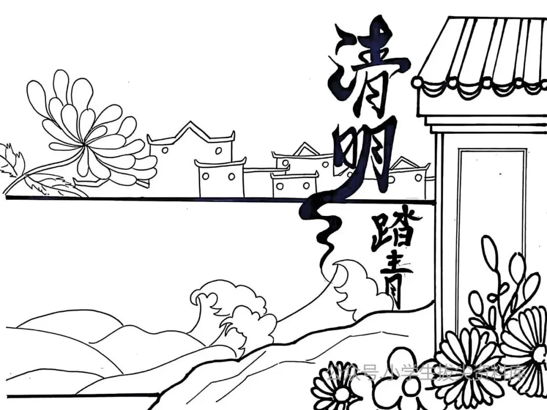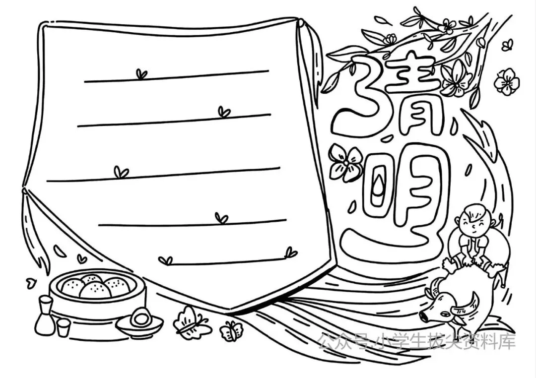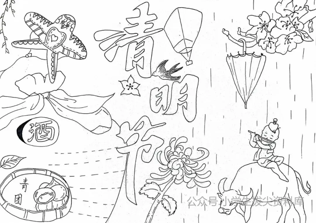 清明手抄报作业不用愁!这6套线稿直接打印就能用,风筝、牧童、青团、江南水乡元素全齐,孩子涂个色就搞定,不费妈不费脑,再也不用熬夜搜教程。