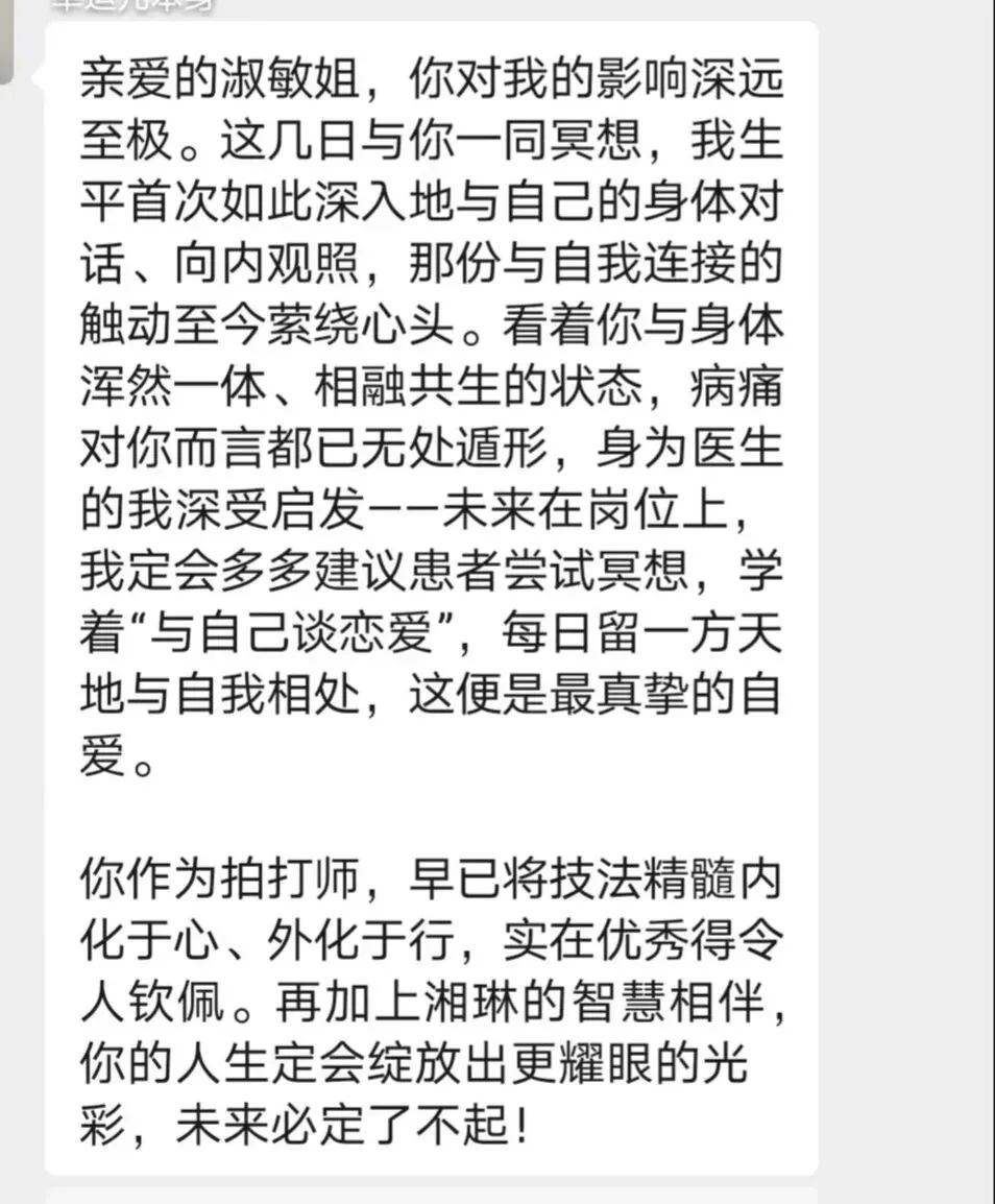 可我也清楚,两三天的短期课程没用,没有陪伴和督促,没有心法的引导,只学手法,终究是治标不治本。