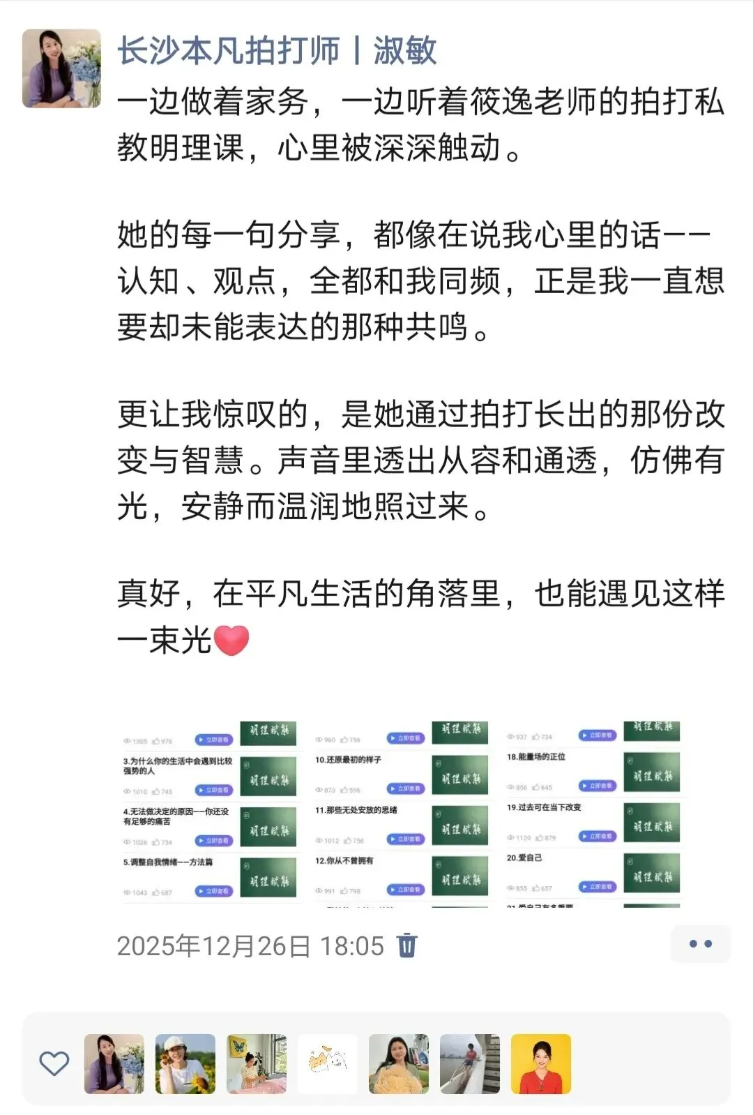 从遇到拍打以来,就开始深入探索认识自我,认知情绪,她能从以前比较困惑不自信的状态走出来