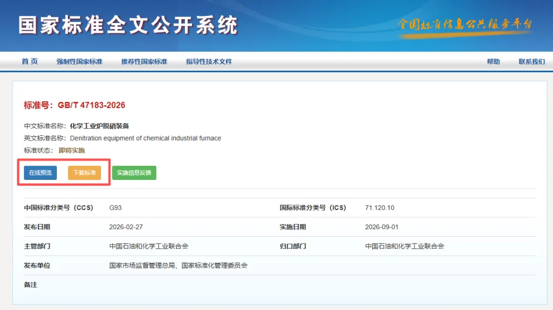 标准于2026 年 2 月 27 日发布,9 月 1 日正式实施,是我国化工行业首个针对工业炉脱硝装备的专项国家标准,具有里程碑式的行业价值与战略意义。随着标准的全面实施,我国化学工业炉脱硝技术将迎来质的飞跃,为行业绿色低碳转型和可持续发展注入强劲动力,同时为全球化工行业 NOx 治理提供中国方案和中国智慧。