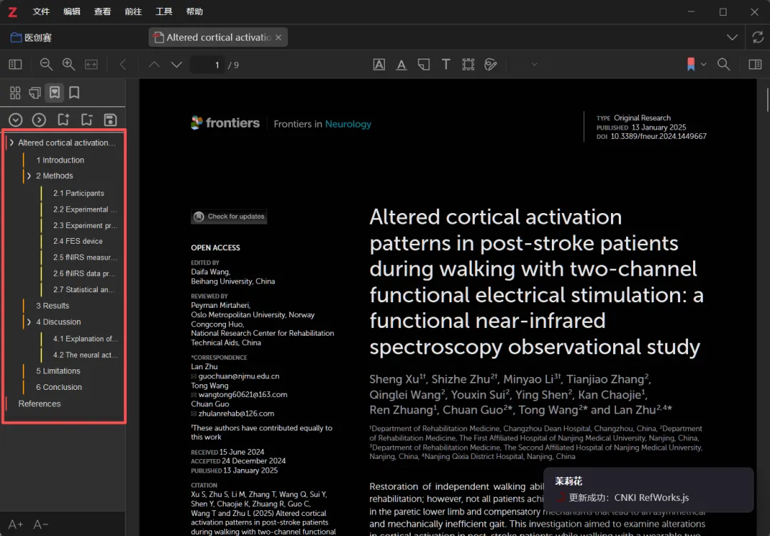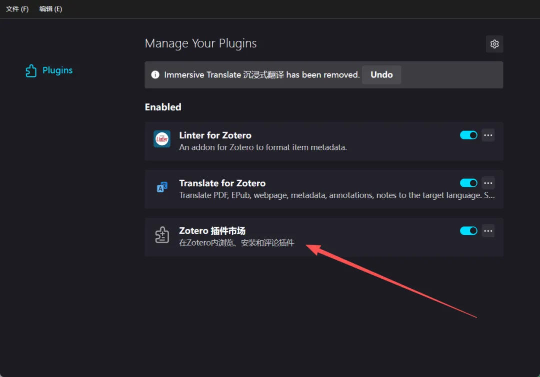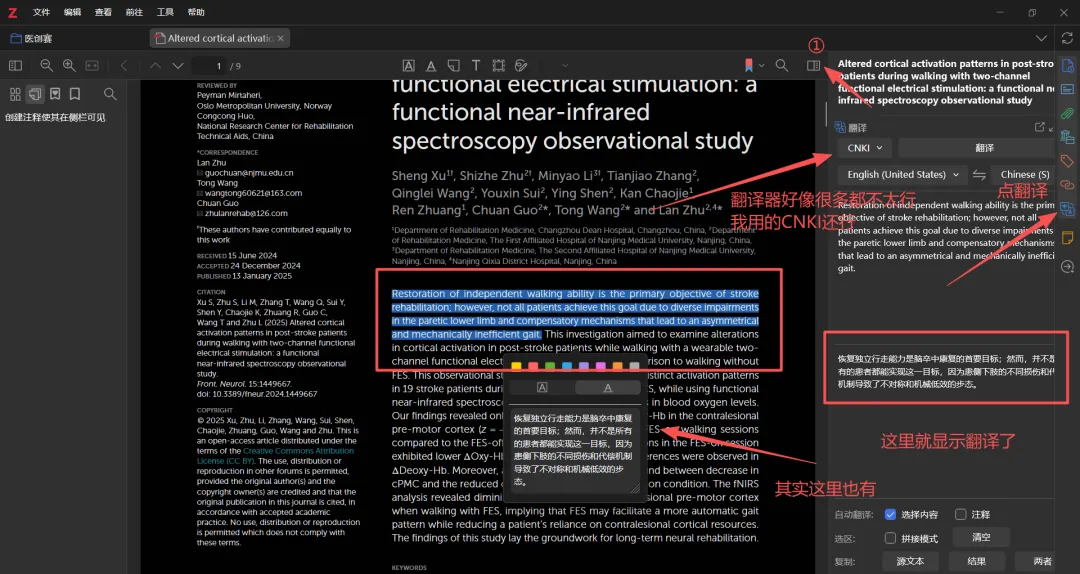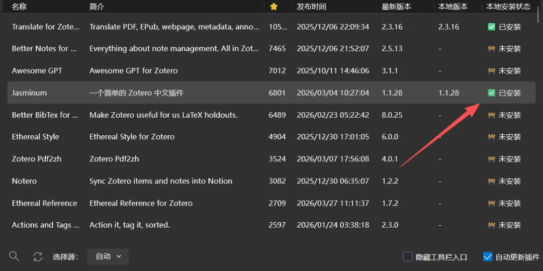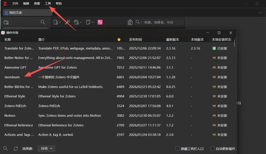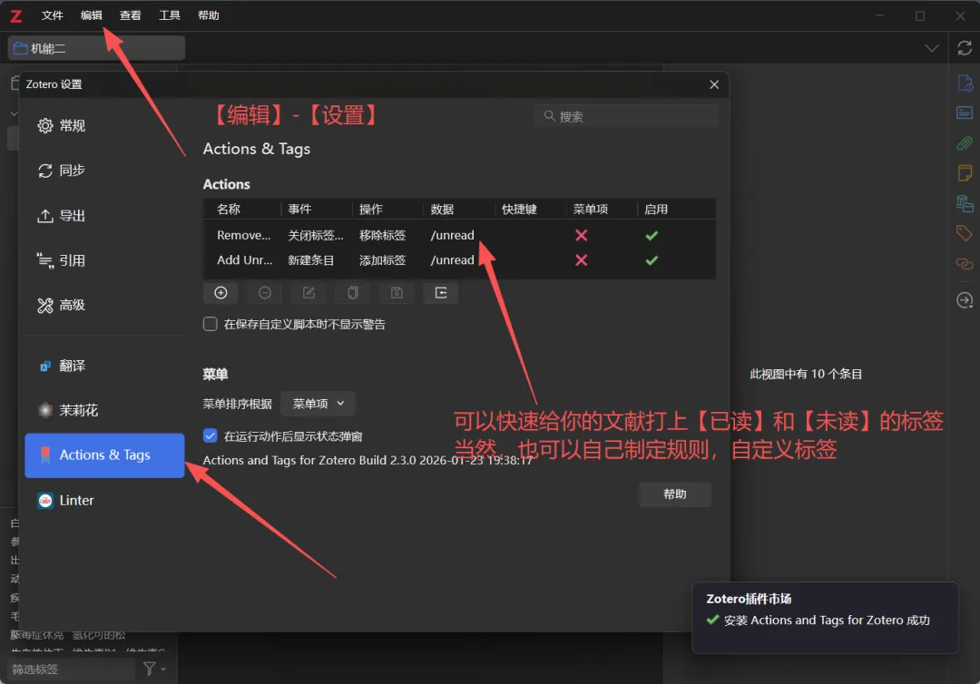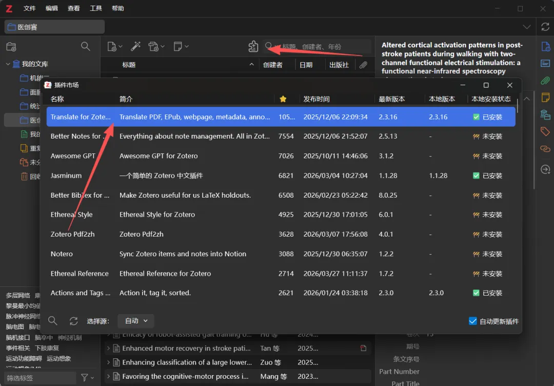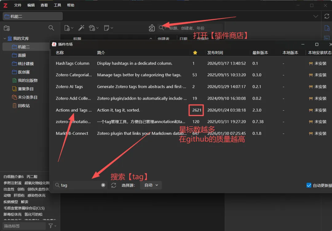 zotero里【工具】-【插件】把刚刚下载的xpi文件拖到这里,就有了【插件商店】好啊,得下载啊,不然你哪来的魔法去github【工具】-【插件市场】,点击茉莉花,再右击选【安装】【茉莉花】插件是专门用来抓取中文文献的,知网、万方、维普都可以用打开Edge浏览器,【扩展】-【管理扩展】-打开【zotero connector】并固定在右上角知网随便搜索一篇中文文献,【zotero connector】会自动抓取【条目】和【PDF】,一般会保存在刚刚打开的文件夹,点击【保存】可以在知网一下子读取一整页的文件,适用于你想了解某一导师发表过的所有论文,非常好用。随便点击几条保存就自动抓取了【条目】和【文件】但不建议一下子抓取太多,容易触发知网的反爬机制,会有大麻烦最好是点进你想要的文件,再保存到zotero除此之外,【茉莉花】还可以自动抓取文献的大纲,点击可跳转。但有时也识别不出来,不过可以自己在茉莉花给出来的书签功能中,自己手动加书签。(我发现英文文献目录一般能抓取,中文文献目录抓取的失败概率就比较大)【Action&Tags for zotero】插件右键点【安装】前面说过,zotero可以抓取一页的文献【条目】和【PDF】,那么这个zotero的【Action&Tags for zotero】插件的对文献进行标签管理就很重要了,小插件的功能很强大,感兴趣可以自己进一步了解插一嘴,点击🔍图标,可以看出zotero的搜索功能是很强大的,可以根据标题等单独搜索还有一个【蒲公英】插件,可以把你所有的文献和已经下载好的插件进行备份,到时候换电脑可以不用重新配置,这个我没怎么用。就不介绍了。【Translator for zotero】插件这个插件很重要,不然看不懂英文文献了【Translator for zotero】插件装上去,我感觉跟小绿鲸文献阅读器差不多了。小绿鲸文献阅读器也很好用的,不过也是要钱,不像zotero完全免费开源。翻译引擎可以自己多试一下,看看哪个跟你的专业领域翻译的更贴合那zotero能全文翻译呢?能的,可以下载【Zotero pdf2zh】插件,但是该插件比较特殊,安装过程比较麻烦,需要有Python环境。