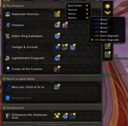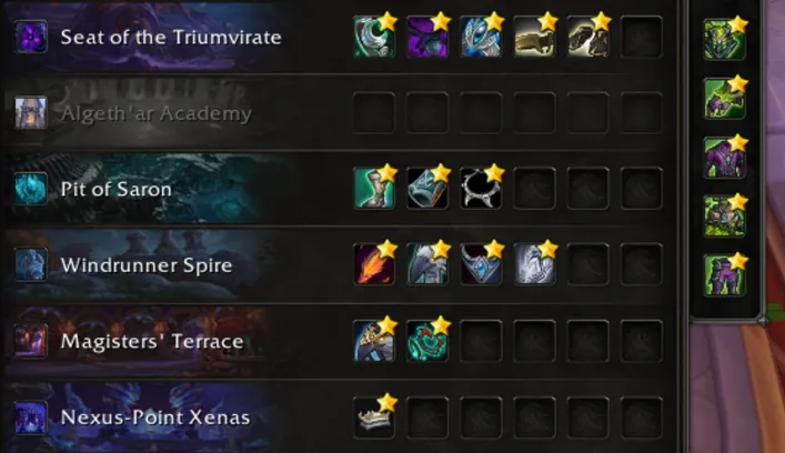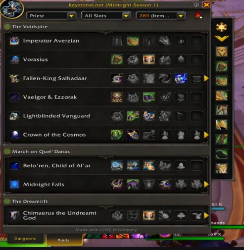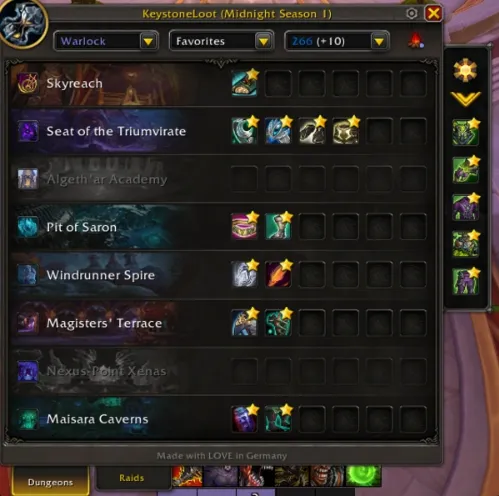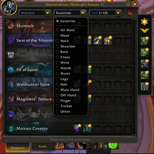玩家可以从左上角下拉菜单选择专长。这样插件就能从地下城和团队Boss中获得过滤装备。之后,玩家可以点击他们想要收藏的齿轮。玩家可以按槽位筛选装备,还可以设置“其他”类别,用于坐骑和房屋装饰。