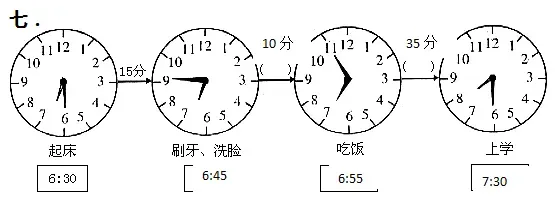 一、填一填:(计21分每空1分) 1一个数除以6,余数最大是( )。 2.( )÷5=6······( )余数最大是( ),当余数最大时被除数是( )。 3. 通常情况下,在地图上上面表示( )方,下面表示( )方, 左面表示( )方,右面表示( )方。 4. 淘气家在学校的北方,学校在淘气家的( )。 5. 一个数从右边起,第四位是( ),它的计数单位是( )。 6. 读数和写数时都要从( )起读写。 7.在( )里填上合适的单位。 练习本长约2( )课桌宽6() 一栋楼高约21()数学书厚1( ) 小亮身高约135( ) 一拃长约15( ) 8.最大的三位数与最小的三位数的和是( ),差是( )。 9.直角是( )°,一个角比它小,这个角是( )。 二、选择题:把正确答案的序号填在( )里(计10分每题2分) 1. 同学们看一场电影所用的时间是( )。 A.20分 B.2时 C.2分 2. 对边相等的四边形( )长方形。 A. 一定 B.可能 C.不可能 3. 有44粒纽扣,每个衣服每件衣服钉5粒,可以钉( )件衣服。 A.7 B.8 C.9 4. 读1050这个数是要读( )个0 。 A.1 B.2 C.一个也不读 5. 笑笑的文具盒长( )。 A.20分米 B.20厘米 C.20毫米 三、判断题:对的打√,错的打×。(计5分每题1分) 1长度单位间的进率都是10 。 ( ) 2. 与百位相邻的两个数位是十位和个位。 ( ) 3. 角的边越长,这个角的度数越大。 ( ) 4. 在钟面上,分针走的最快。 ( ) 5. 5008读作五千零零八。 ( ) 四、我是计算小能手。 1口算:(8分每题1分) 56÷7= 60÷7= 7×9= 3×8= 52-19= 46-6= 57+35= 46+34= 2. 用竖式计算。带*的要验算(12分每题3分) 45÷8= *57+241= 209-15= *400-199= 五、下面的图形哪些是角?请打“√”,不是请打“×”。(5分) 六、画一画,从给出的三个点出发,画三个角。分别画一个直角,一个锐角,一个钝角。(6分) 七.先写出钟面上的时刻,再算一算经过的时间。(4分) 八、解决问题。 1.王老师买来一条绳子,长20米,剪下5米修理球网,剩下多少米?剩下的每2米做一根跳绳,可以做几根跳绳?还剩多少米?(4分) 2.有45个同学,每8人一组,可以分几组?还剩几人?(4分) 3.明明买来20条金鱼,送给淘气2条,剩下多少条金鱼?如果把剩下的平均放在4个鱼缸,每个鱼缸放多少条金鱼?还剩多少条?(4分) 4今年的六一儿童节二(3)班的43名同学一起租车去参观博物馆, 如果每辆车限乘8人,同学们至少要租多少辆车?(4分) 5.一种自行车原价是388元,现在商场进行促销活动,每辆降价99元,请你算一算现在每辆多少钱?(4分) 6.由3、1、0、0能组成不同的四位数。(9分) (1)、把它们按照由小到大的顺序排列起来。 (2)、组成的最大的四位数是多少? (3)、组成的最小的四位数是多少? 参考答案: 一、填一填:(计21分每空1分) 1( 5 )。 2.(4 )( 34 )。 3.( 北)方,(南)方,(西 )方,( 东)方。 4.(南方)。 5.(千位),(千)。 6.(高位 ) 7.(分米)(分米)(米)(厘米)(厘米)(厘米) 8.(1099),(899)。 9.(90)°(锐角)。 二、选择题:把正确答案的序号填在( )里(计10分每题2分) 1.( B )。2.(B ) 3.( B ) 4. A )。 5.( B )。 三、判断题:对的打√,错的打×。(计5分每题1分) 1 ( × ) 2.(× ) 3.( × ) 4 ( × ) 5.( ×) 四、我是计算小能手。 1口算:(略) 3. 用竖式计算。带*的要验算(12分每题3分) 45÷8=5······5 *57+241=298 209-15=194 *400-199= 201 五、下面的图形哪些是角?请打“ √ ”,不是请 打“×”。(5分) 六、 八.解决问题 1.答:剩下15米.剩下的每2米做一根跳绳,可以做7根跳绳。还剩1米。(4分) 2.答:有45个同学,每8人一组,可以分5组。还剩5人。(4分) 3.答:剩下18条金鱼。如果把剩下的平均放在4个鱼缸,每个鱼缸放4条金鱼。还剩2条。(4分) 4答:如果每辆车限乘8人,同学们至少要租6辆车。 5.答:现在每辆289元。 6.(1)、把它们按照由小到大的顺序排列起来。 1003 < 1030 < 1300 < 3001 < 3010 < 3100 (2)组成的最大的四位数是3100 。 (3)组成的最小的四位数是1003 。