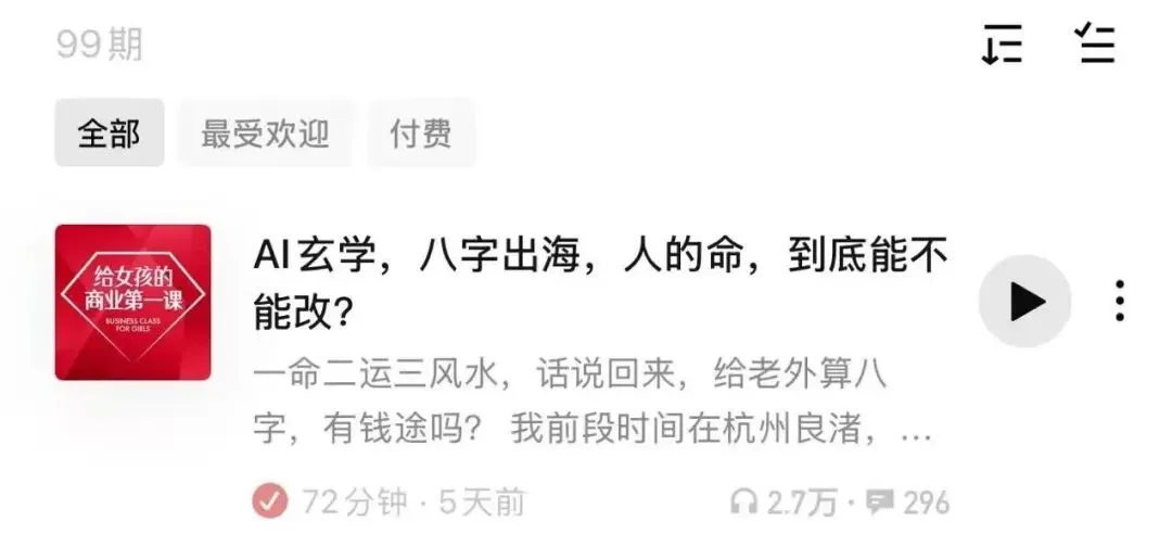 今天听了一期讲玄学出海的播客。我本身对算命、排盘这类事就挺感兴趣,所以特意去听了这一期,没想到听完收获意外,甚至有种人生小屋里,某扇天窗被骤然打开的感觉,遂分享给大家,希望有些帮助。