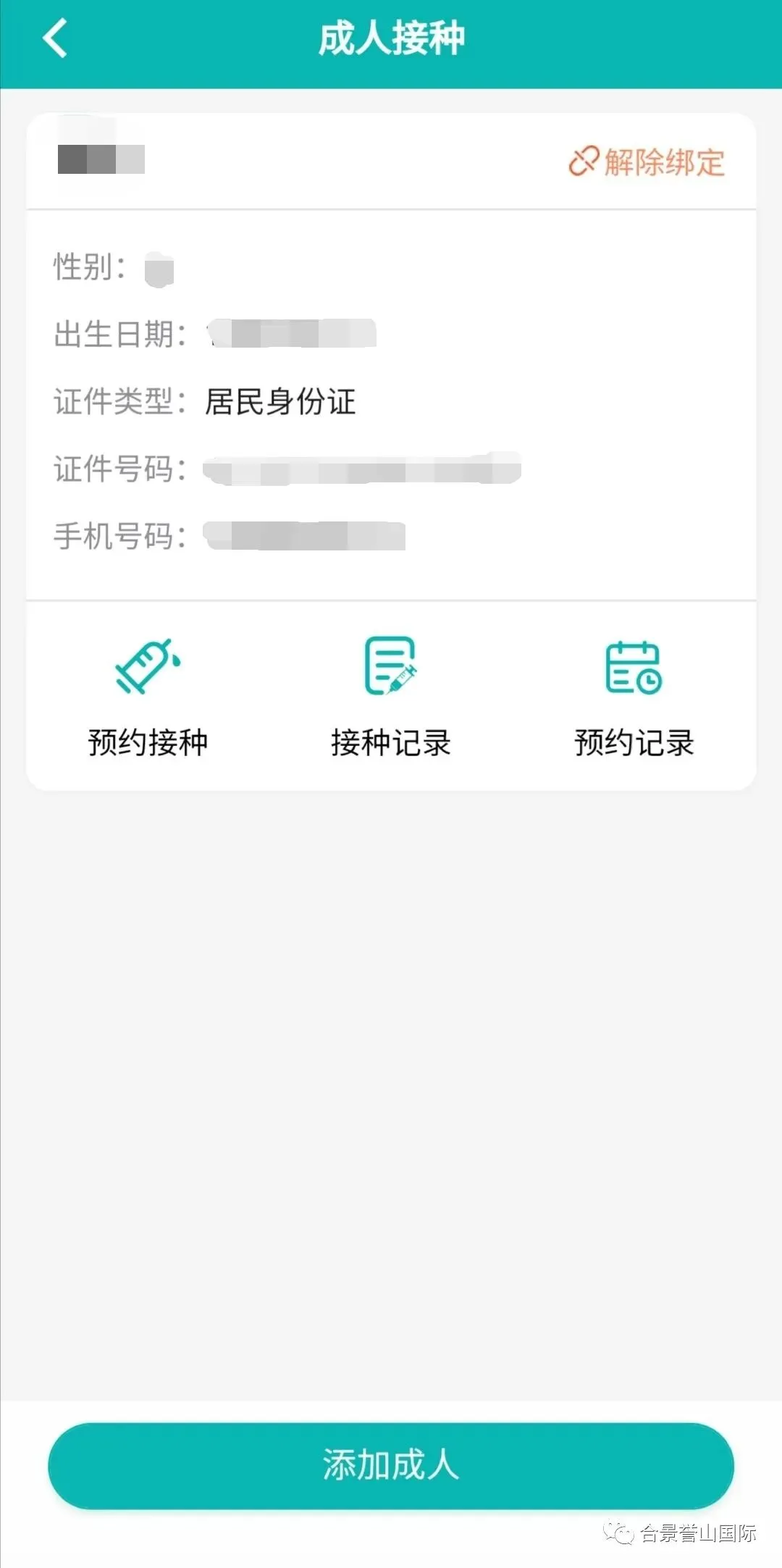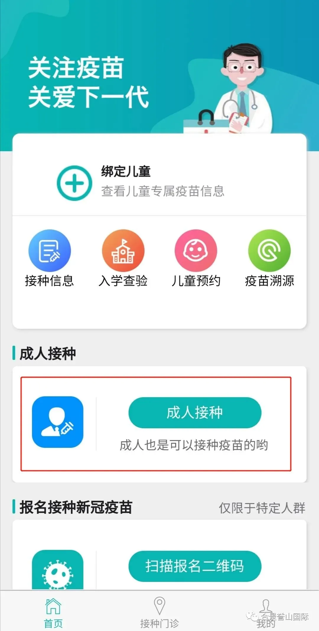 第四步–成人预约:实名认证成功之后,点击“成人接种”,输入对应的信息,点击立即绑定,即可绑定成功;