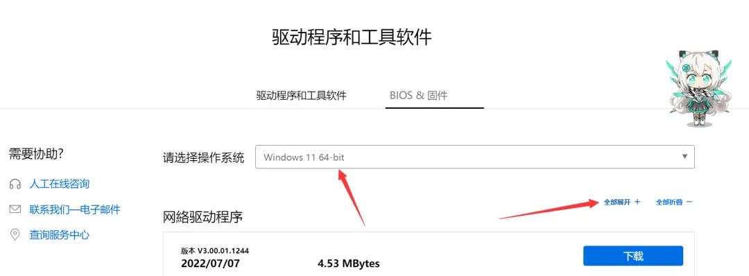 其实就是一款桌面宠物,但是它支持所有Windows 10和Windows 11系统,只需要在华硕驱动官网,选择对应的系统,点击全部展开
