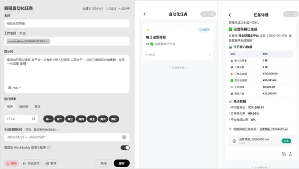 定时任务类:日报/周报/月报自动生成、精准推送,同步完成数据趋势对比,省去手动整理时间; -