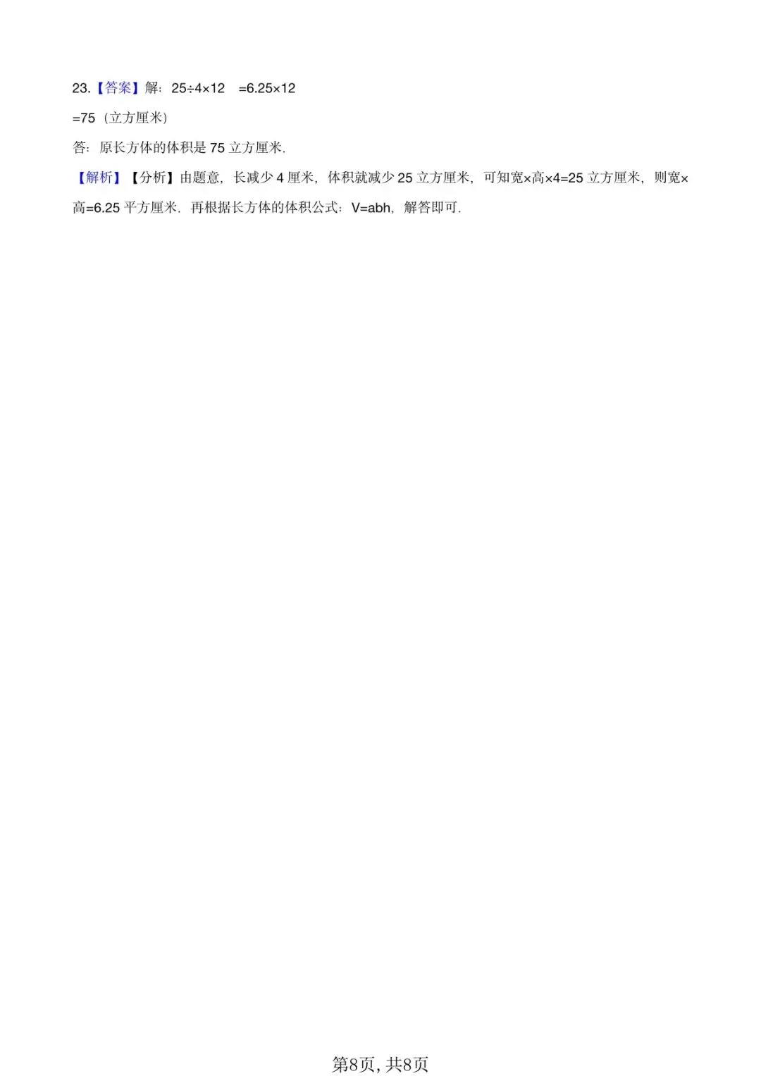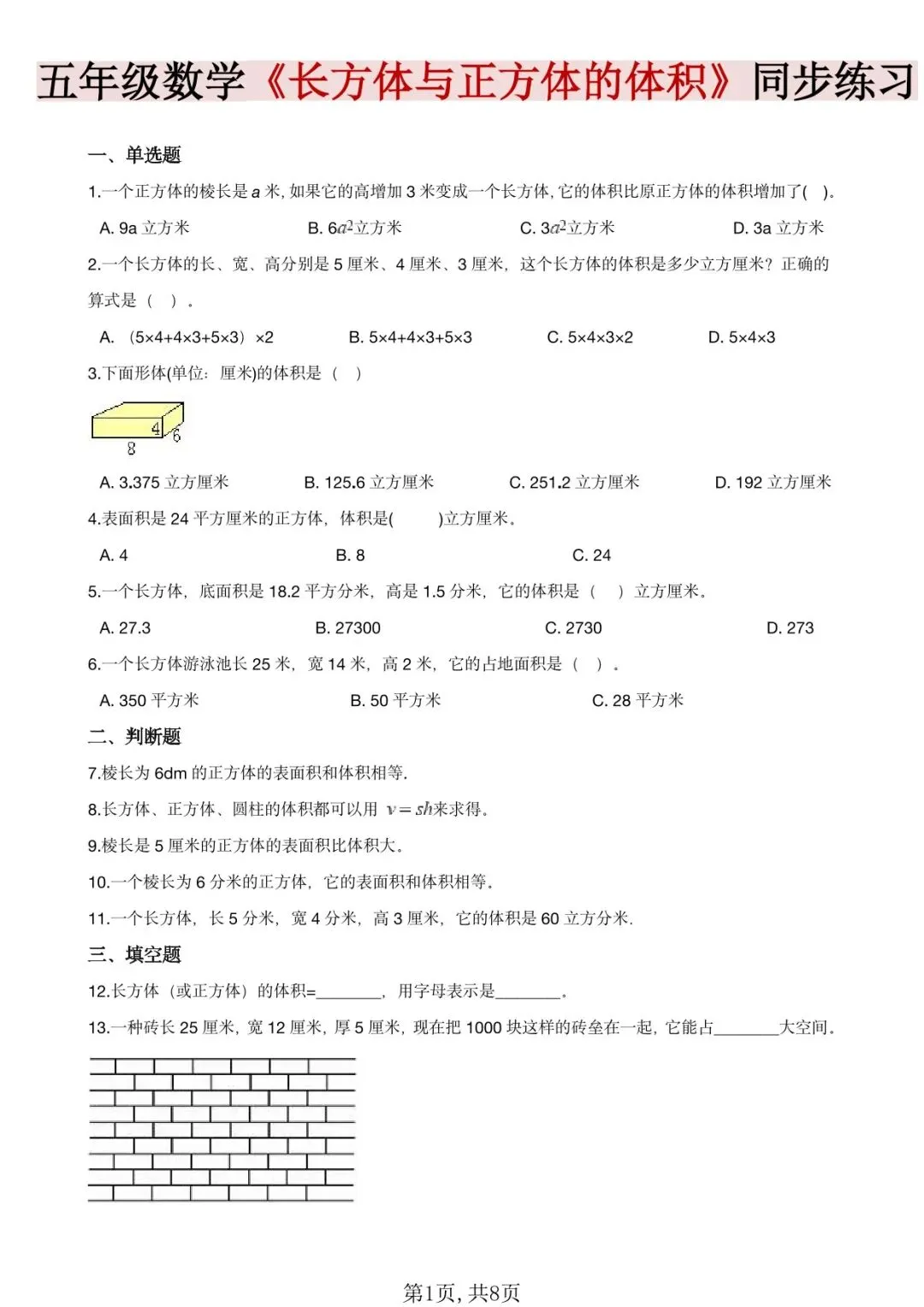 可下载丨26春五年级下册数学《长方体、正方体的体积》同步练习,电子版