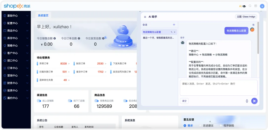 场景 2:xx物流策略不会配?不用翻手册找路径,问 AI:“xx物流策略怎么配置”,直接给入口 + 步骤 + 目的,新手也能秒上手商派ShopeX。 -