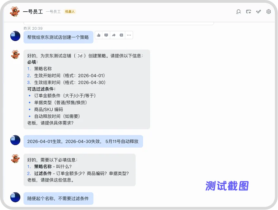 场景 4:想创建策略,不用一步步填表单,告诉 AI:“帮京东测试店建个策略,随便起名,无过滤条件”,AI 自动生成,省心又省力商派ShopeX。