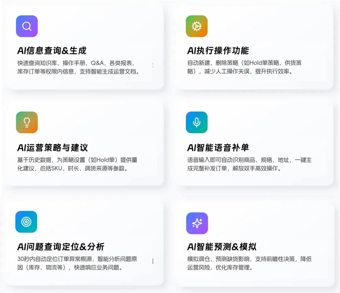 OMS业务中台系统功能强大,但对于运营人员的操作能力要求也较高。OMS项目上线后需要服务商提供长时间的培训和问题解答。AI助手则像是为每一个运营人员都配备了随时在线的“OMS系统专家”,能够随时随地解答难题,提供建议,指导操作。让运营人员都能快速上手。