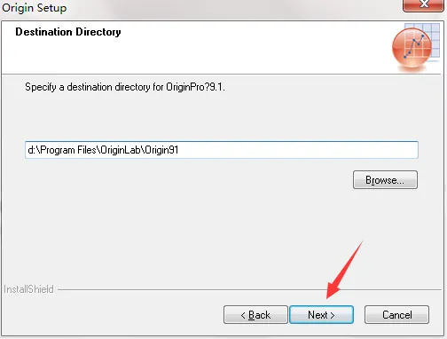 9、点击“Browse”更改软件安装路径,建议安装到除C盘以外的磁盘,可在D盘或其它盘里面新建一个“Origin91”文件夹,然后点击“Next”。