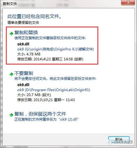 16、返回安装包文件夹,将破解文件中的“ok9.dll”复制到软件安装目录(参照第九步路径)然后点复制和替换,替换掉原文件(64位系统则替换“ok9_64.dll”)。