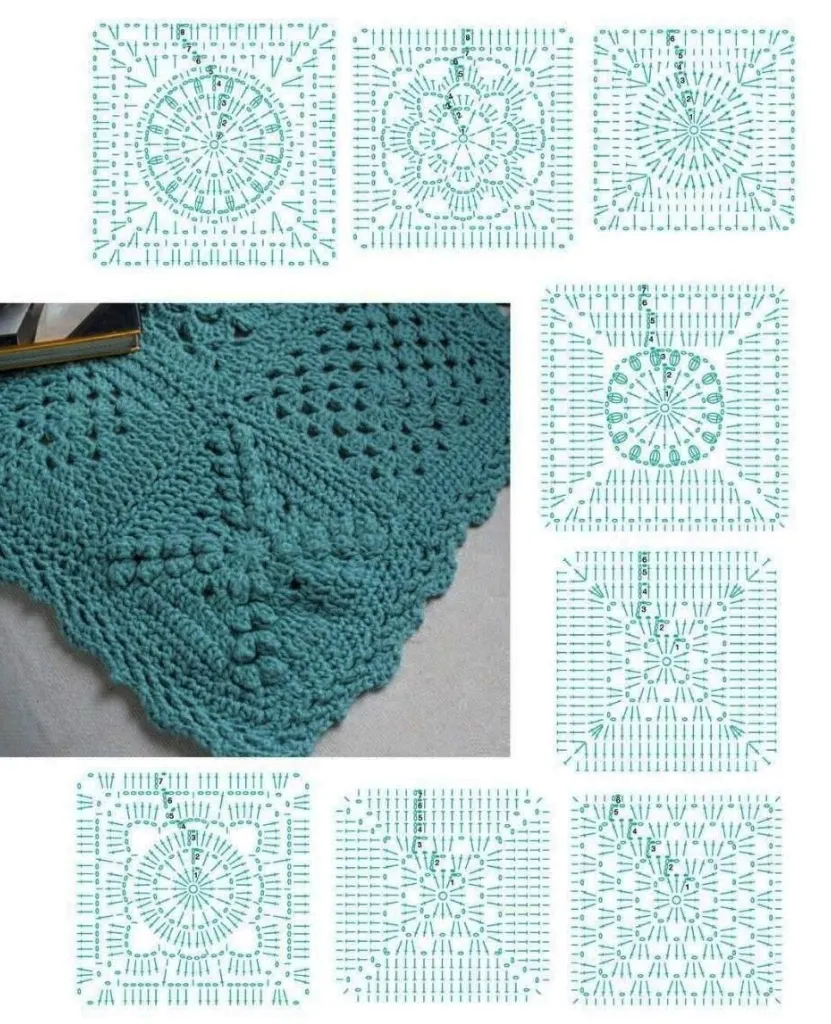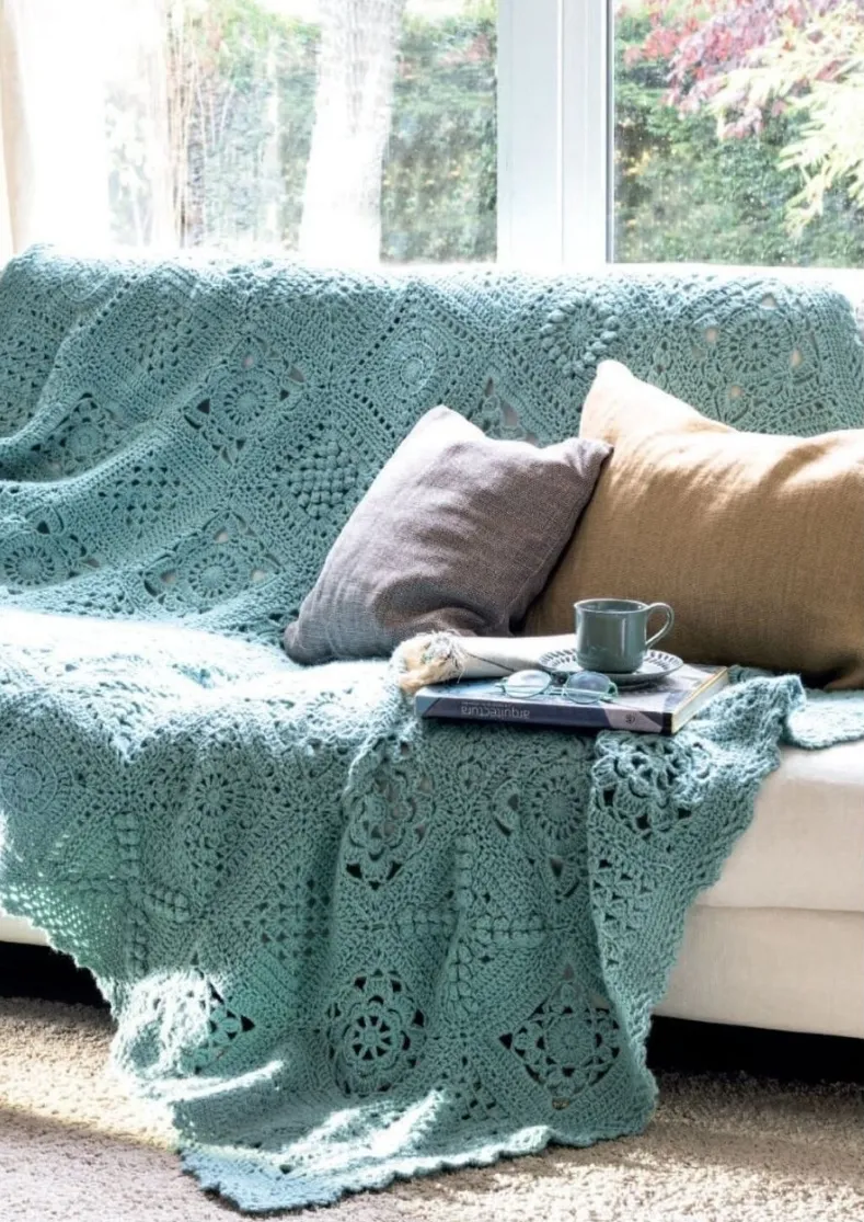 这款蓝绿色梦想毯子钩织时倾注了许多心血,充满对细节的爱。每个花片都采用不同的花样进行钩织,最后再拼接成整条毯子。