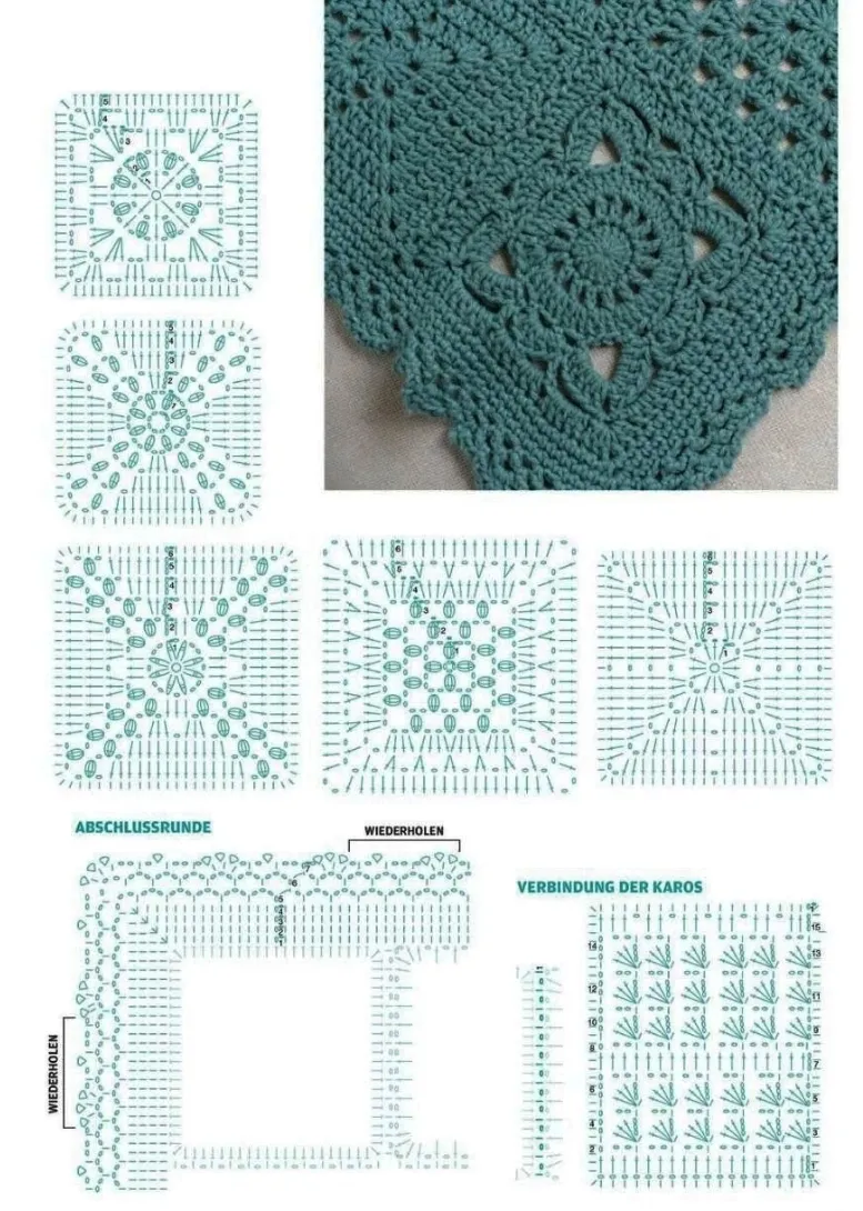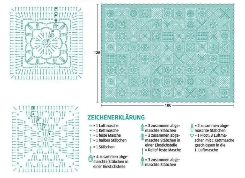 薄荷绿梦,钩针拼花盖毯图解+钩织说明