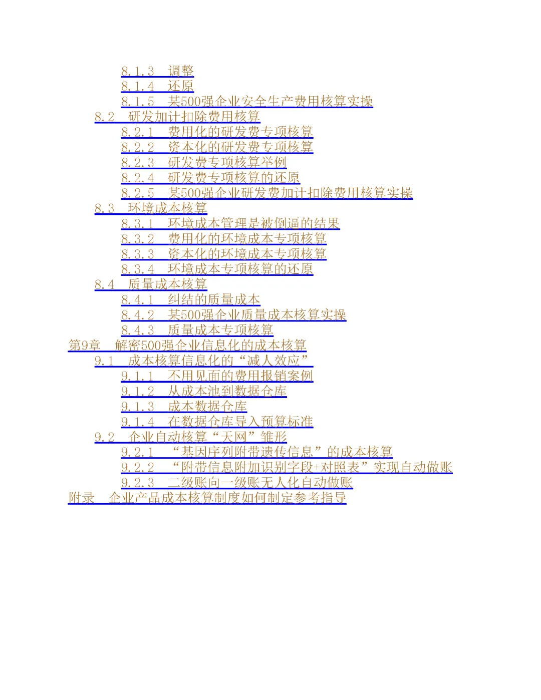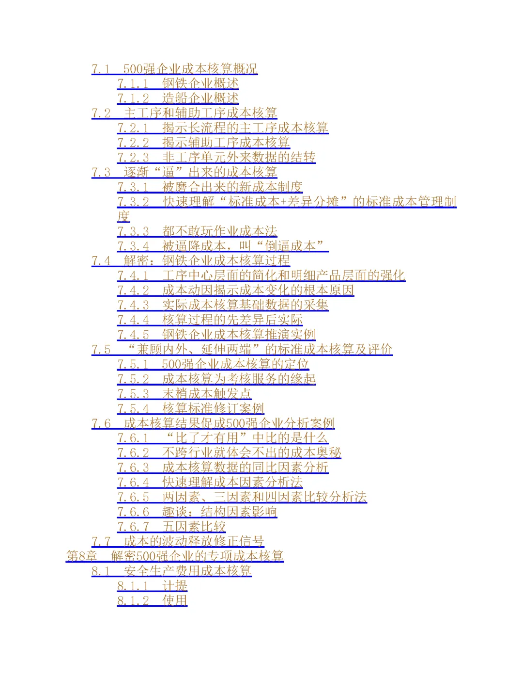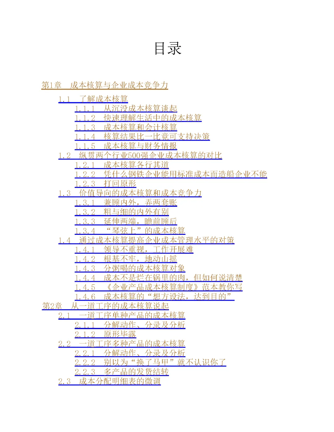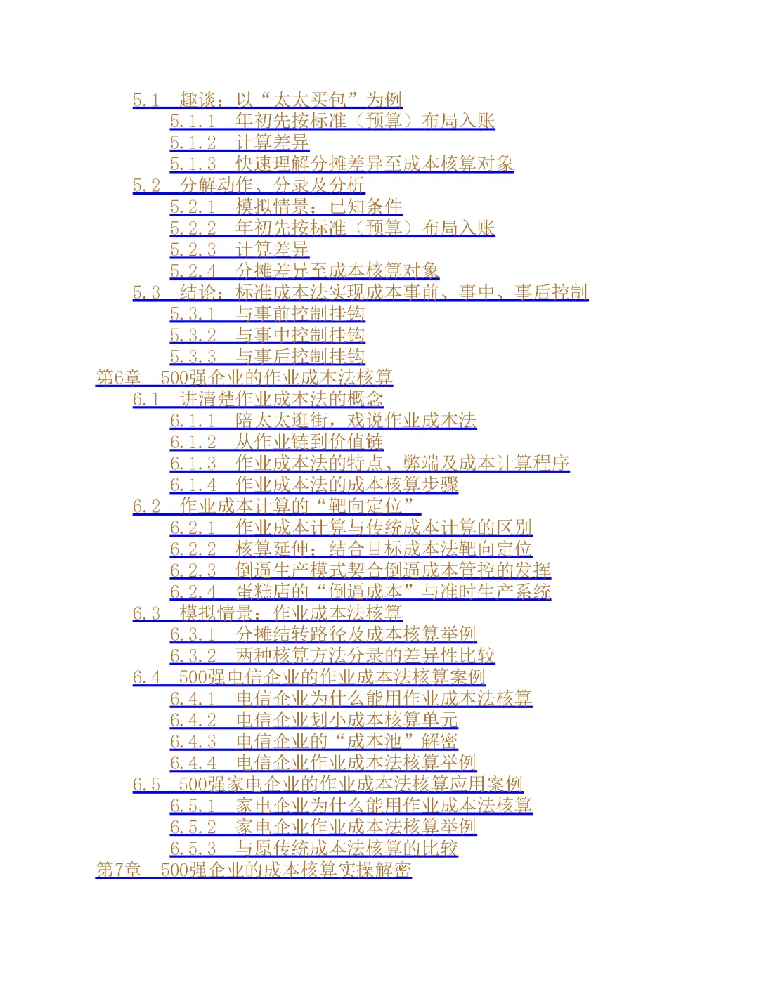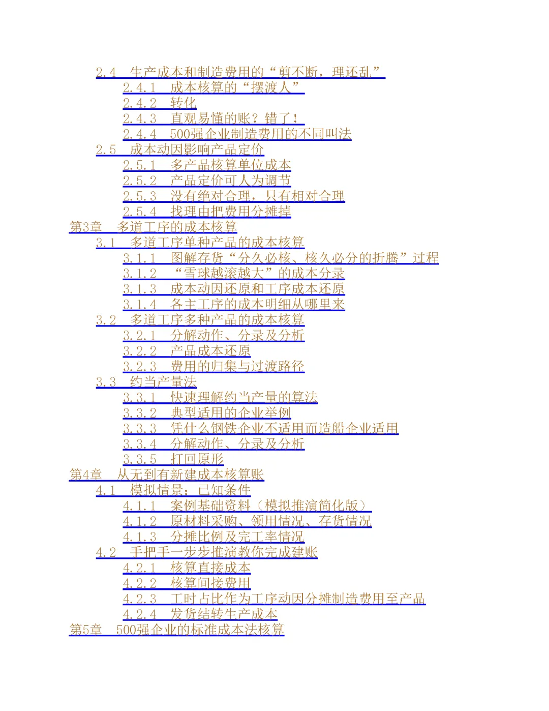 包括:成本核算与企业成本竞争力、从一道工序的成本核算说起、多道工序的成本核算、从无到有新建成本核算账、500强企业的标准成本法核算、500强企业的作业成本法核算、500强企业的成本核算实操解密、解密500强企业的专项成本核算、解密500强企业信息化的成本核算