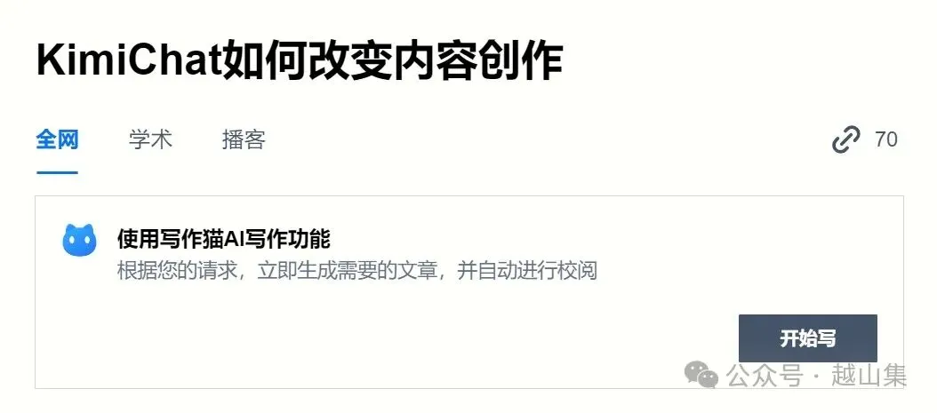如果在界面上选择“研究”,搜索出来的结果已经洋洋洒洒几千字了。可以顺势点击“开始写”,用写作猫将收集的主题信息写成一篇文章。很方便。至于效果,见仁见智。