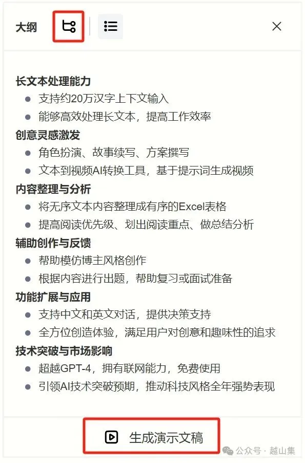 在搜索结果右边可点“生成演示文稿”,就将结构化的内容变为”PPT”。但目前这PPT不能修改,不能下载,只能在线分享。