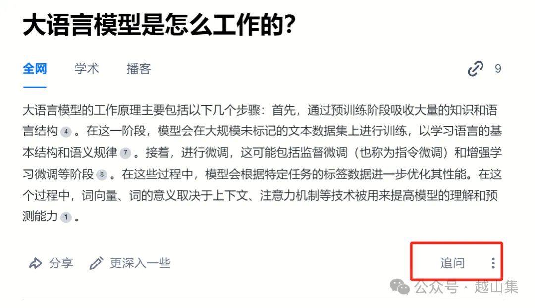 正常这种AI工具都是支持追问的,但秘塔搜索的追问按钮故意设计得很隐蔽,就在搜索结果的下方,不是很明显。最开始我使用时,硬是没找到。