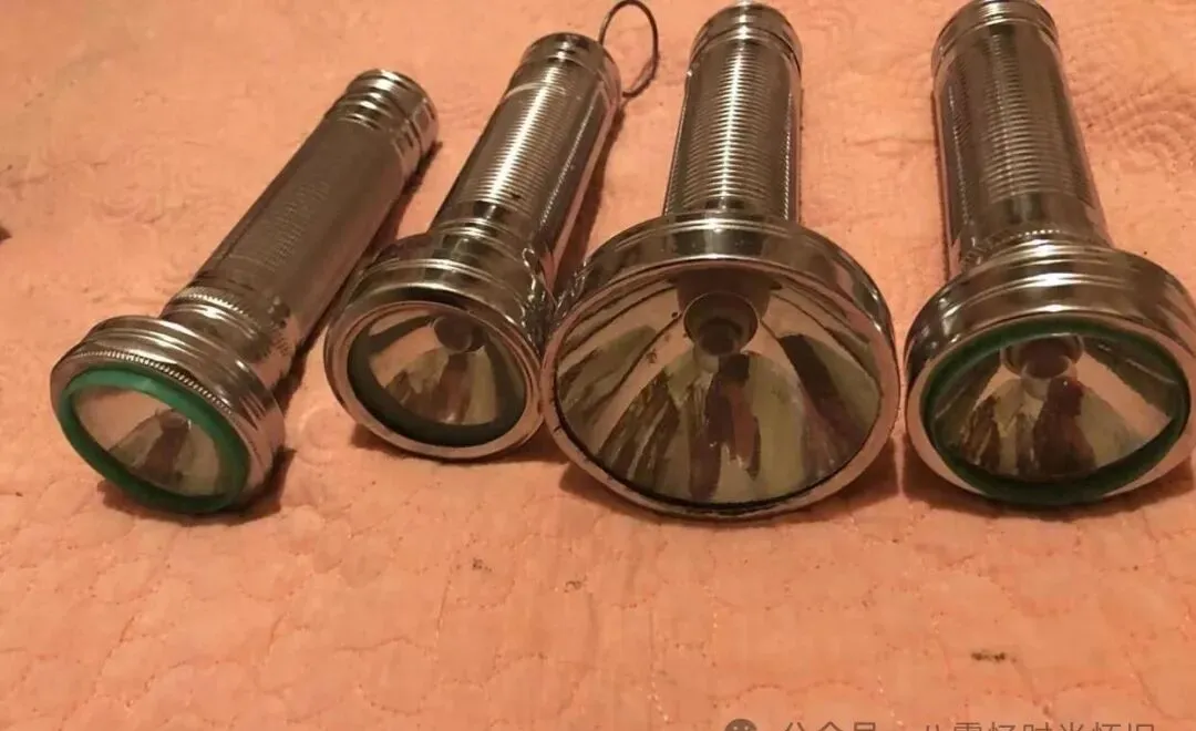 说起照明,小时候村里电灯不靠谱,晚上全靠铁皮手电,图里一排就是那种,镀锌亮光,头大身粗,塞进两节大电池才肯亮,灯头一按亮黄亮黄的,照不远、还特容易晃眼,走夜路手必得死死握着,没电了就敲两下,又能支棱一会儿,陪我在院子捉过无数次蟋蟀,十一二点老爸出去喂牛也只伸手摸一把手电筒,有时候忘了提,黑灯瞎火回家踉踉跄跄,屋里人听着院外“咔”一声才知道人回来了。