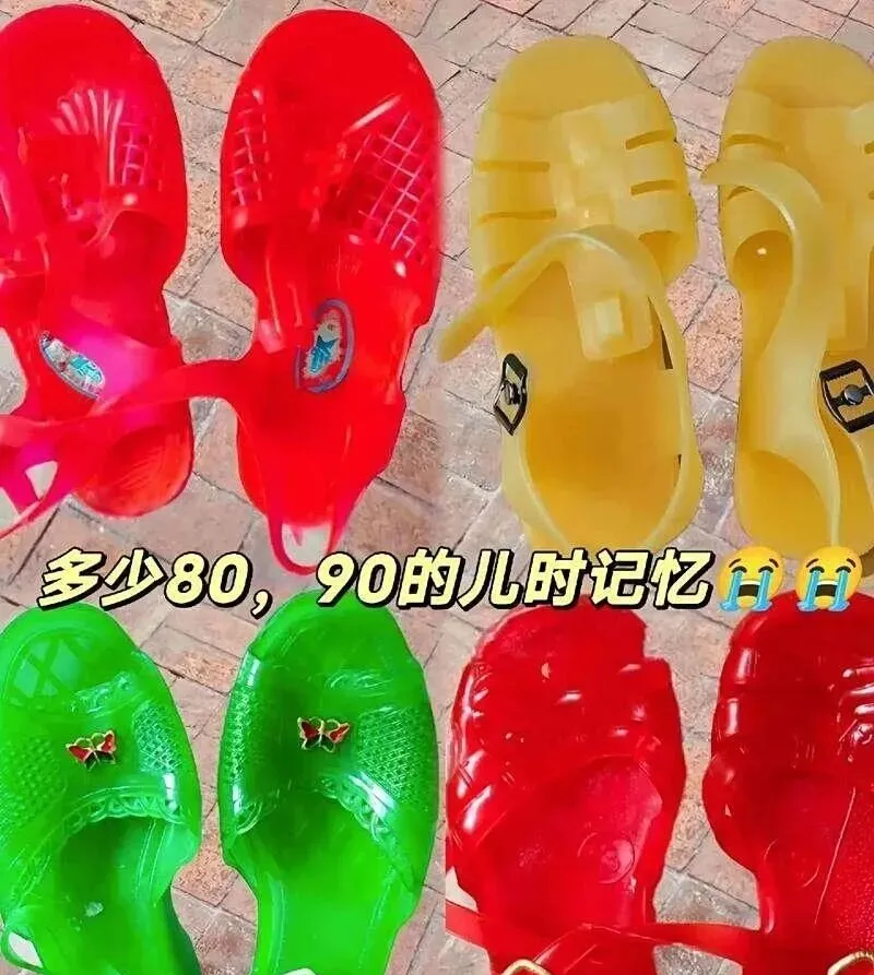 这个鲜亮亮五颜六色的东西,叫塑料凉鞋,八九十年代的农村小孩没几个没穿过的,红的黄的绿的,走起路来噼噼啪啪响,天气一热全村孩子都赤脚穿上它,水坑泡泥全不怕,鞋头磕破了再贴个贴画就成新鞋,每次换新货都是村头小卖部摆出来,孩子们围着挑颜色,比谁的鞋最亮堂,我穿过一双黄的,前面带蝴蝶结,还学堂里笑掉牙,说我是女娃子,其实那会儿家长根本不讲究这一套,只看结实能穿,一双能对付大半年。