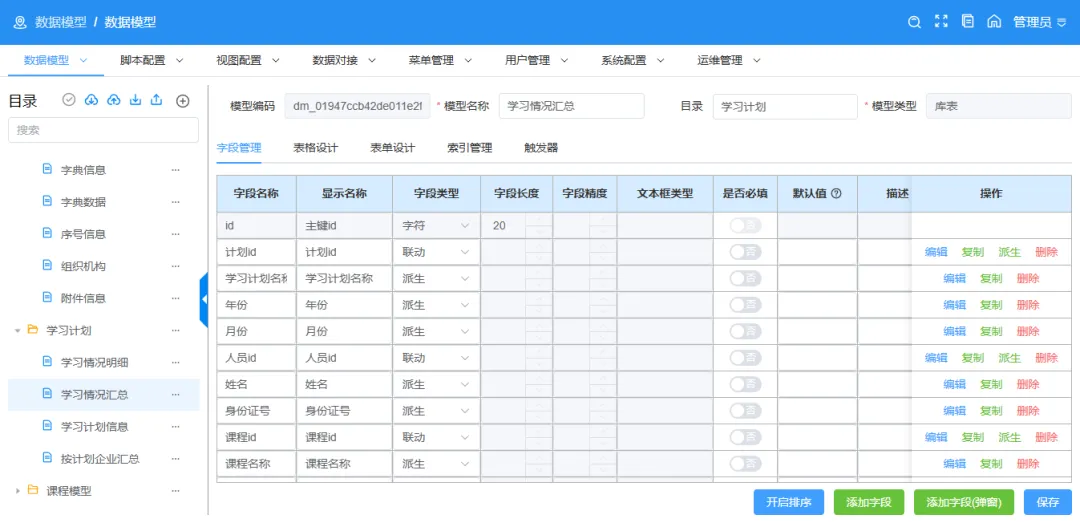 字符:【自动生成】为【是】时,【自动生成序】来源于【系统配置 -> 序号配置】,需要手动添加序配置联动:与其它数据模型/人员/组织机构/字典表关联,查出特定字段信息派生:必须与联动字段同时出现,派生配置中的【来源字段】指联动字段关联表中的字段