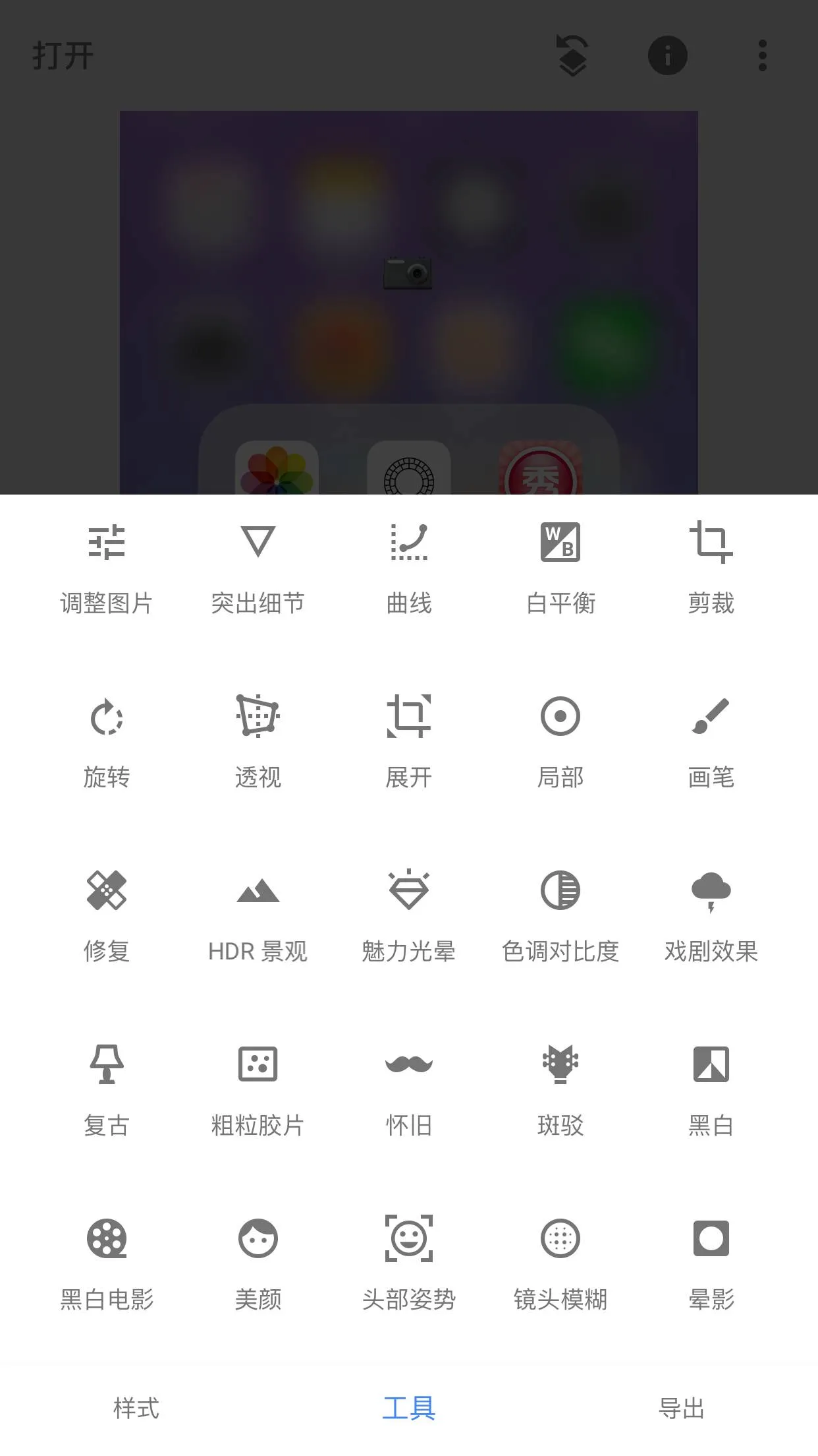 第二项就是工具,不要小看这个选项,一张照片能调什么,能怎么调,都在这边了。实话说,但凡一个修图工具,99%能调整的项目,都在这儿了。