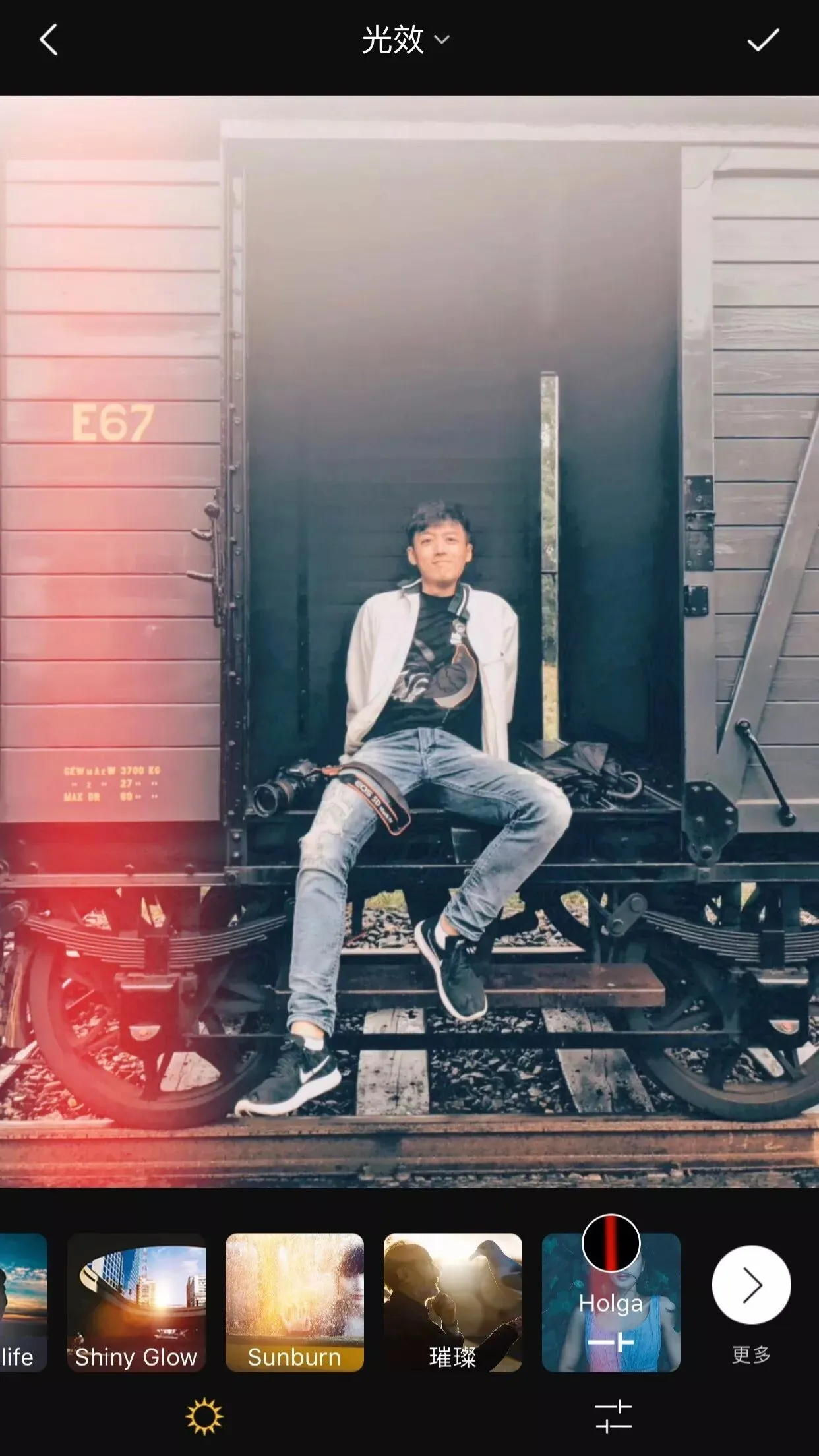 其实这个APP还有一个值得一提的地方,就是可以在拍好的照片上,加上光晕。有太阳光啊,反射光啊什么的,都非常提气氛。我比较喜欢的是这个胶片漏光的效果。