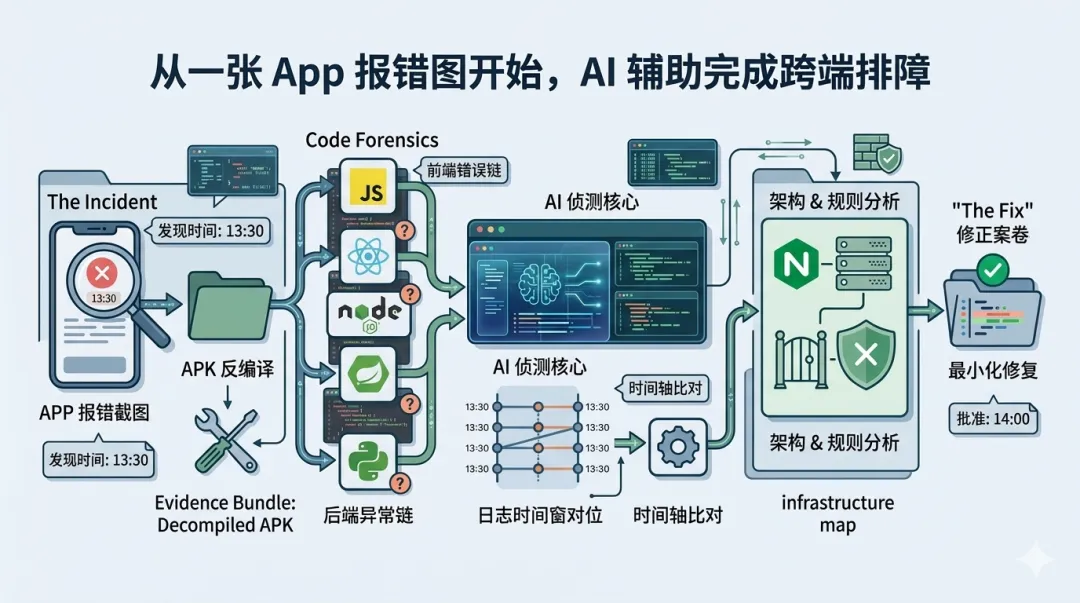 但这次不一样。AI 帮我把这件事拆开了:先拆 APK,看错误是谁说的;再联查后端代码,看异常是从哪一层冒出来的;最后对日志、看配置,把整条证据链串起来。