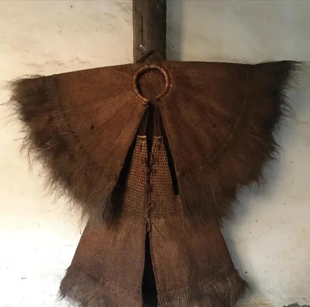 墙上挂起的这个“披风”叫蓑衣,南方多,不过北方下地干活也有,麻编的,沾水不湿,外面一层硬毛防雨,从前没伞没雨衣,谁要是披着蓑衣走田埂,远看一团黑呼呼的,小时候偶尔调皮把蓑衣扛着当斗篷,结果地里的泥水全顺着蓑衣流到鞋里,妈妈在屋里一瞪眼就知道我又玩脏了。