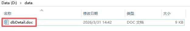 然后在D盘下新建一个文件夹data,在其中新建一个dbDetail.doc空白文档。