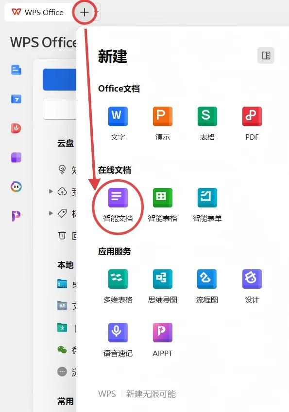【1】打开WPS,点击窗口左上角的“+”号,然后点击“在线文档”项中的“智能文档”。