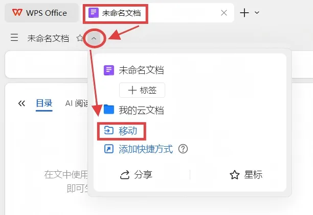 【3】点击标题栏的“未命名文档”,可更改文档的名称。点击“未命名文档”右边的箭头符号,在弹出的菜单中,点击“移动”可更改文档位置。