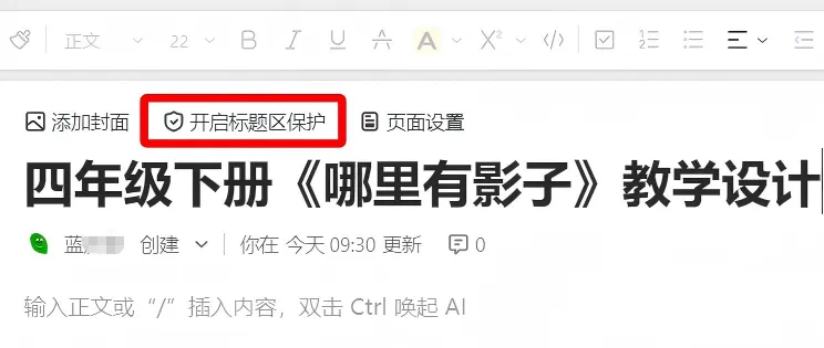 【4】将教学设计的标题复制或输入到智能文档的标题区域,点击“开启标题区保护”可防止文档标题在协同备课的过程中被他人修改。
