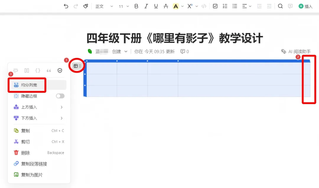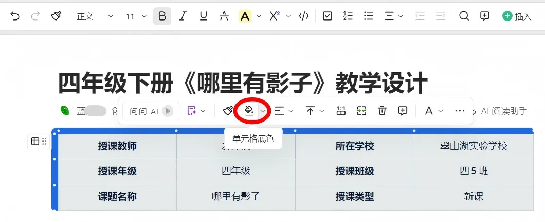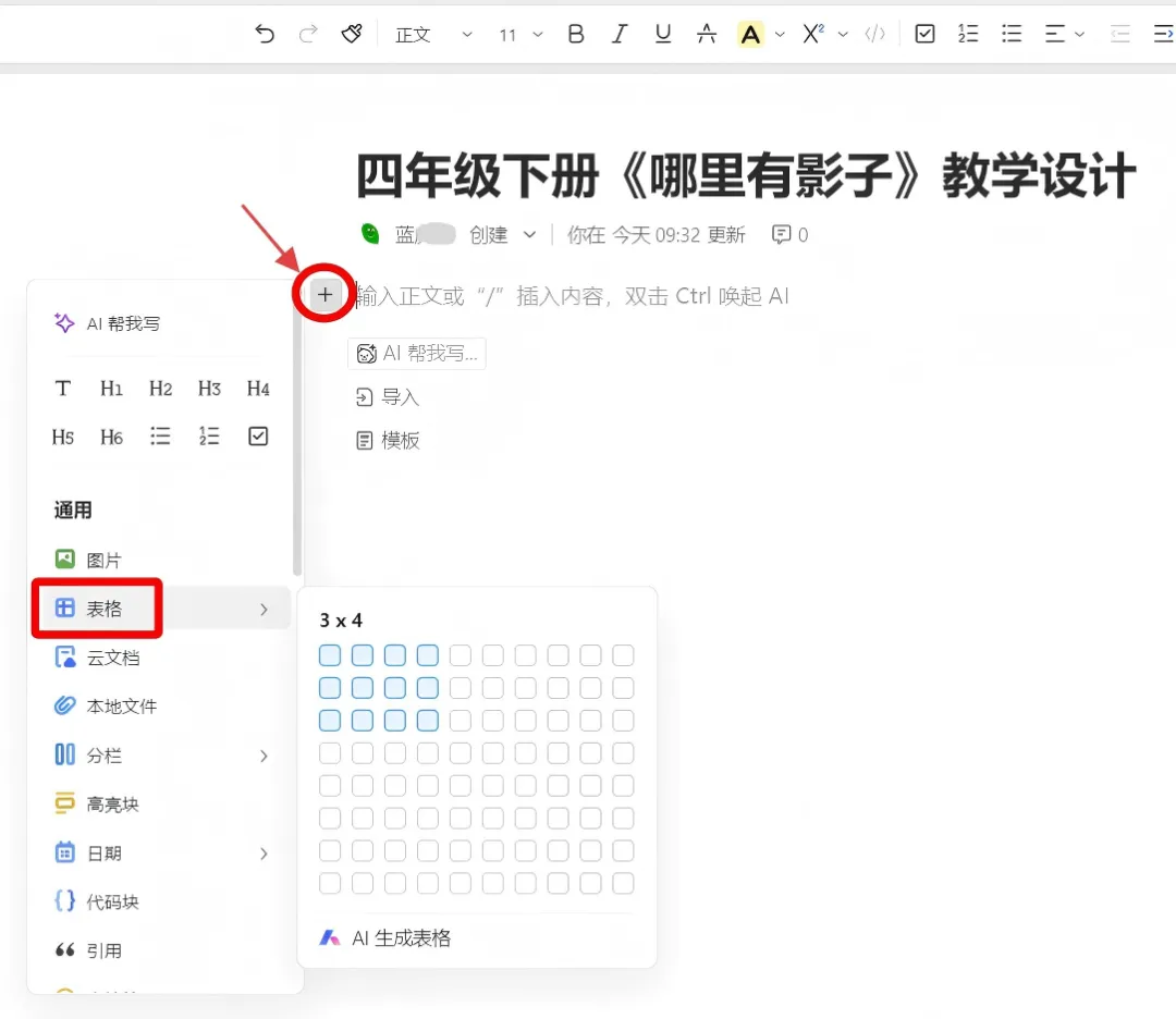 【5】点击文档内容区域左上角的“+”号,在弹出的菜单中点击“表格”插入表格,便于填写课例信息。