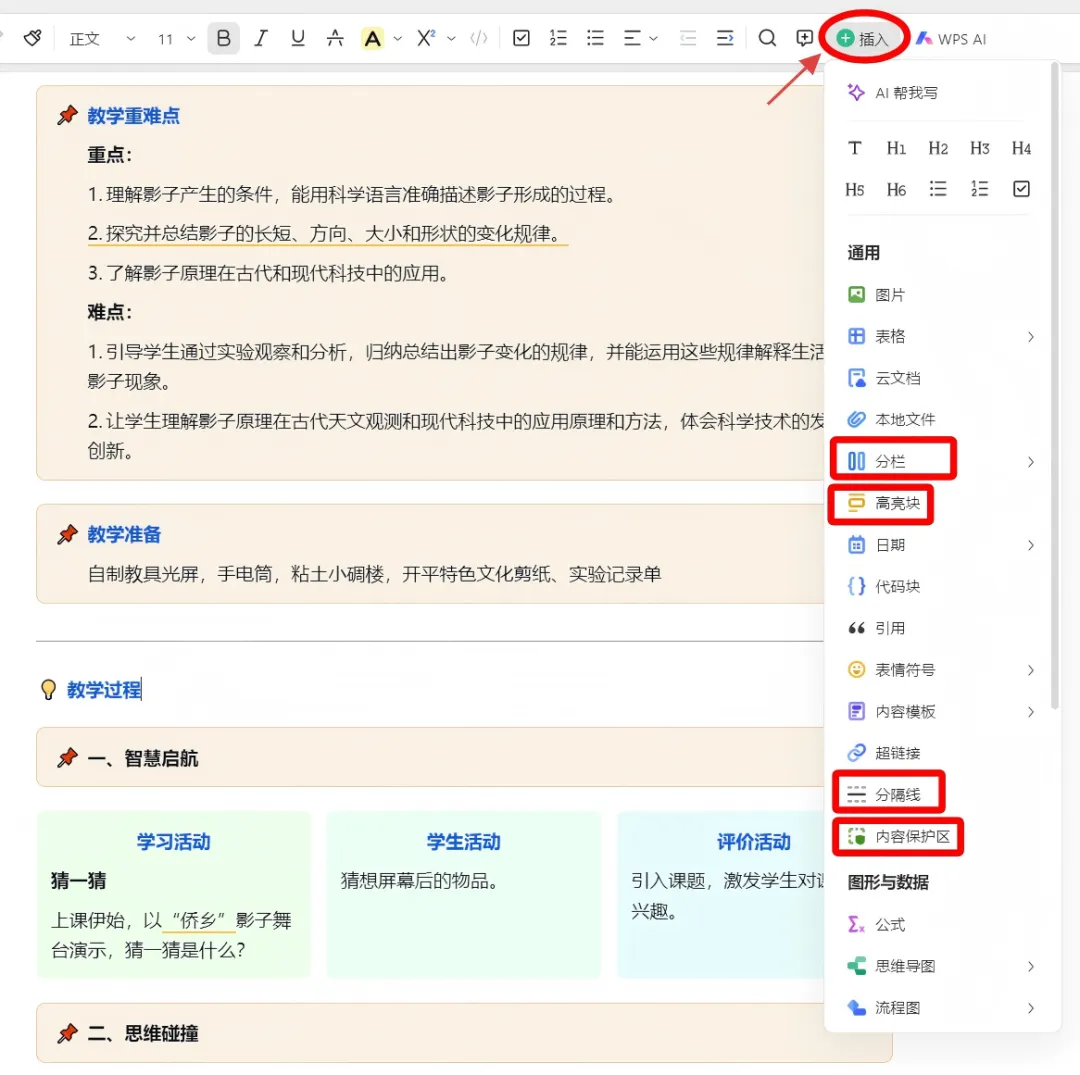 【7】除了点击文档内容区域左上角的“+”号,还可点击上方工具栏中的“插入”按钮来添加文档的内容。在弹出的菜单中,可先点击“高亮块”插入多个内容区域,然后将教学设计初稿的内容分板块复制到不同的高亮块区域中;如需分栏,可使用菜单中的“分栏”功能,还可使用“分割线”对内容进行区域分隔。