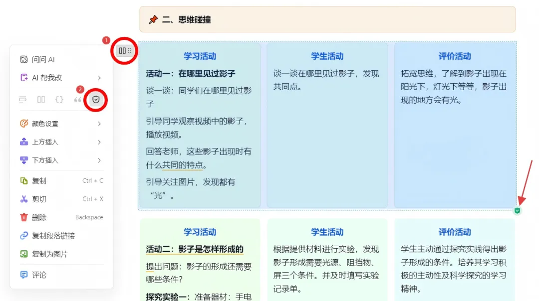 【8】输入完内容后,可点击高亮块左上角的图标,在弹出的菜单中,点击盾牌状图标可将该区域内容保护起来,防止在协同备课的过程中被他人修改。