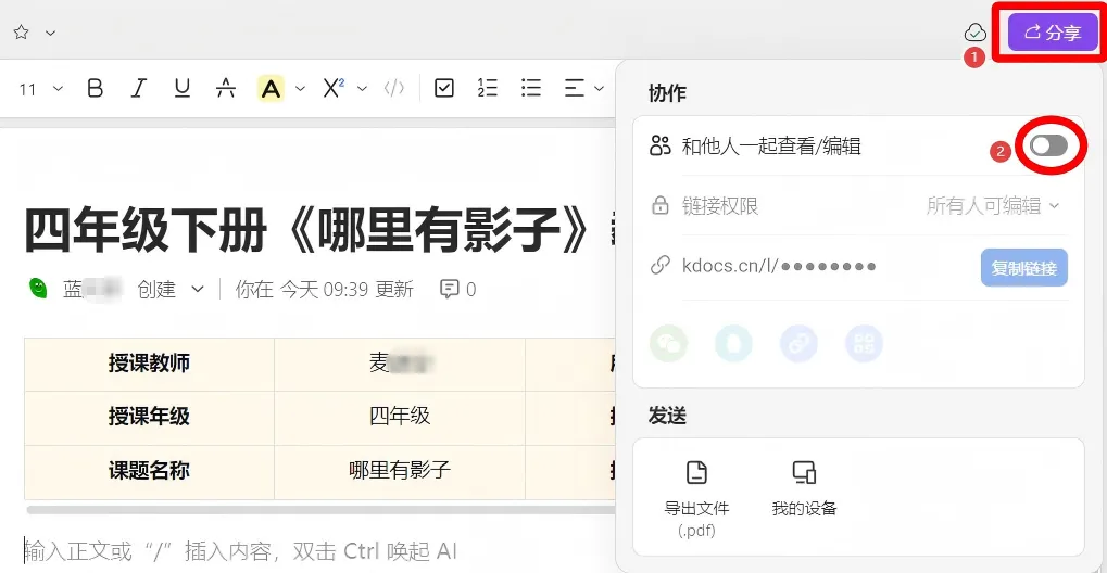 【9】录入完所有内容后,点击文档右上角的“分享”按钮,把“和他人一起查看/编辑”开关打开。