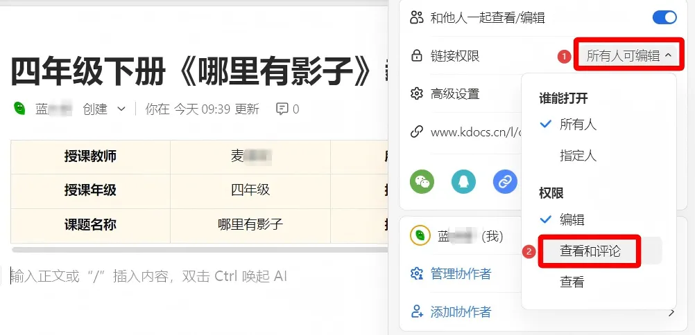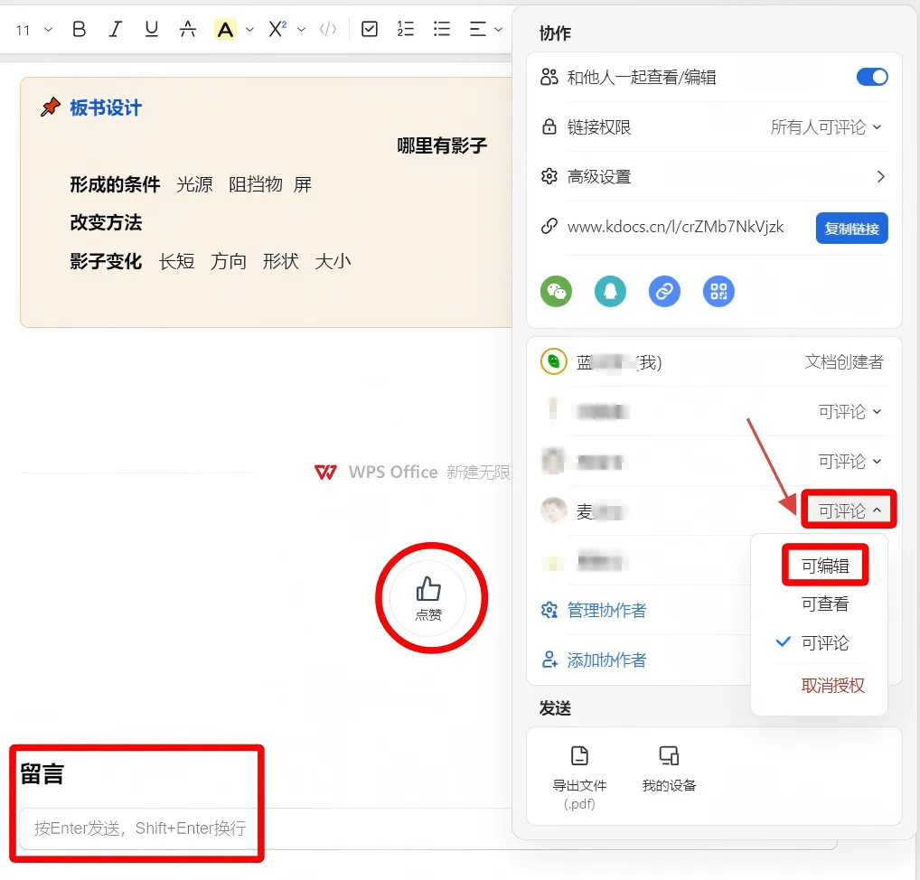 【11】点击“管理协作者”可单独设置每个人的权限,一般把主备教师的权限修改为“可编辑”。文档底部有“点赞”、“留言”功能,每个协作者都可使用。