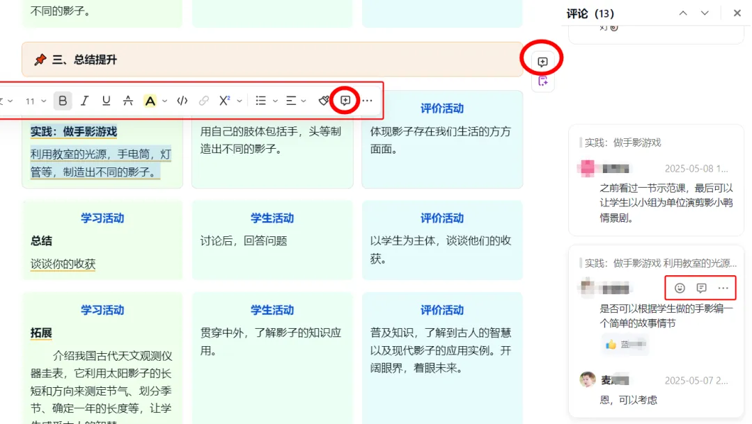【12】协作者在阅读教学设计时,鼠标移到某一行上,该行内容右边会出现评论图标,或选中某些文字,也会弹出工具栏,工具栏上也有评论图标,点击评论图标可给对应的内容提出意见或建议。评论内容会出现在内容的右侧,主备教师和其他协作者可对该评论进行回复。
