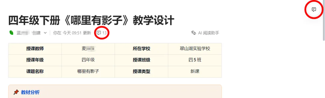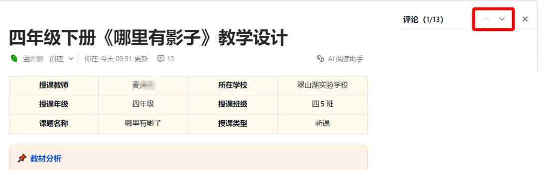 【13】在完成协同备课后,主备教师可点击标题下方或页面右上角的评论图标,通过右侧浮窗的上下箭头可查看每一条评论。