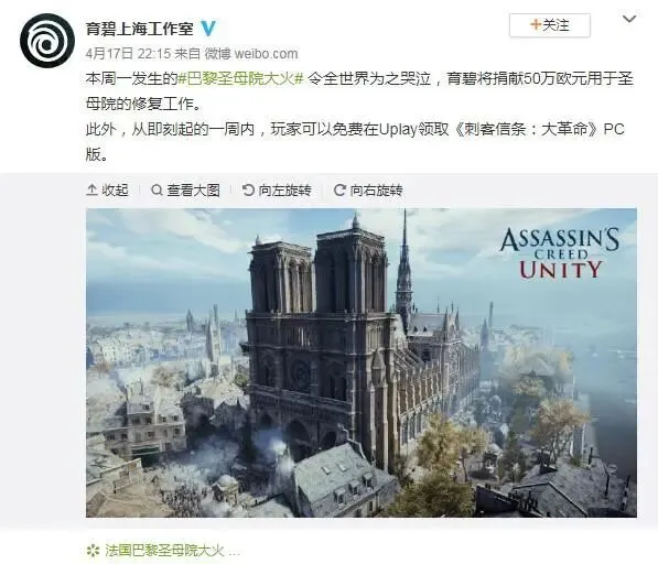 当初,巴黎圣母院大火,育碧直接全网送《刺客信条·大革命》,甚至《黑旗》《看门狗》都免费送过。